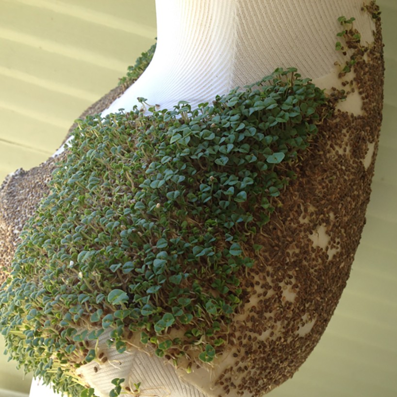 Un experimento de moda Empezó decorando una camiseta sin mangas de tela con semillas de chía y luego se la puso. maniquí de exhibición y lo colocó en agua para que las semillas recibieran el líquido necesario para su crecimiento. Y después de una buena semana, la camiseta sin mangas comenzó a florecer, Esponnette formó entonces el estampado final que podéis admirar en las fotos.
