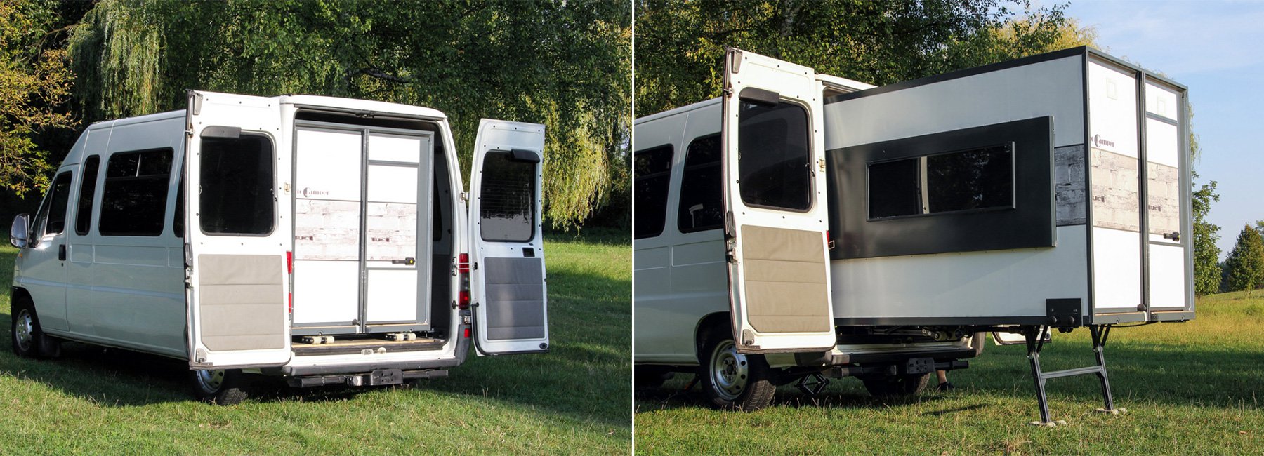 iocamper puede caber en la parte trasera de cualquier furgoneta L1, H1, H2, H3 o más grande. La carcasa expandible es larga cuando se comprime 2,5 metros, ancho 1,3 metros y alta 1,7 metros. Los usuarios podrán elegir entre tres alturas diferentes ioCamper y consíguelo en estilo moderno, 'vintage', country o veraniego. Se necesita configurar una 'casa móvil' 5 a 10 minutos y crece aprox. cuatro veces tamaño, en comparación con el estado 'comprimido'. Tiene suficiente espacio para 4 personas, pero no se requieren para su transporte permanente conversión de la furgoneta excepto paneles de fijación para adjunto 'trailers' para ella más seguro transporte.