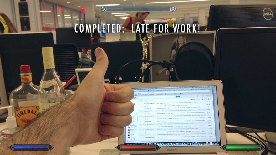 Domišljija ilustratorja Adama Ellisa ne pozna meja. Vsaj tako se zdi ob pregledu njegovega fotografskega projekta, ki predstavlja kako bi izgledalo naše vsakodnevno življenje skozi oči igralca popularne računalniške igrice The Elder Scrolls: Skyrim. Ko nas ne ogrožajo zmaji in ostale podobne grozote, se zdi življenje v računalniški igrici kar malce dolgočasno. Toda bodimo brez skrbi, nadarjeni ilustrator zna spremeniti tudi popolnoma običajen dan v nekaj ekstremno zabavnega. Komaj čakamo, da nekdo izumi tovrstno igro, oziroma še bolje, računalniško igrico, v kateri bomo morali delati. Zagotovo jo bomo igrali med delom.