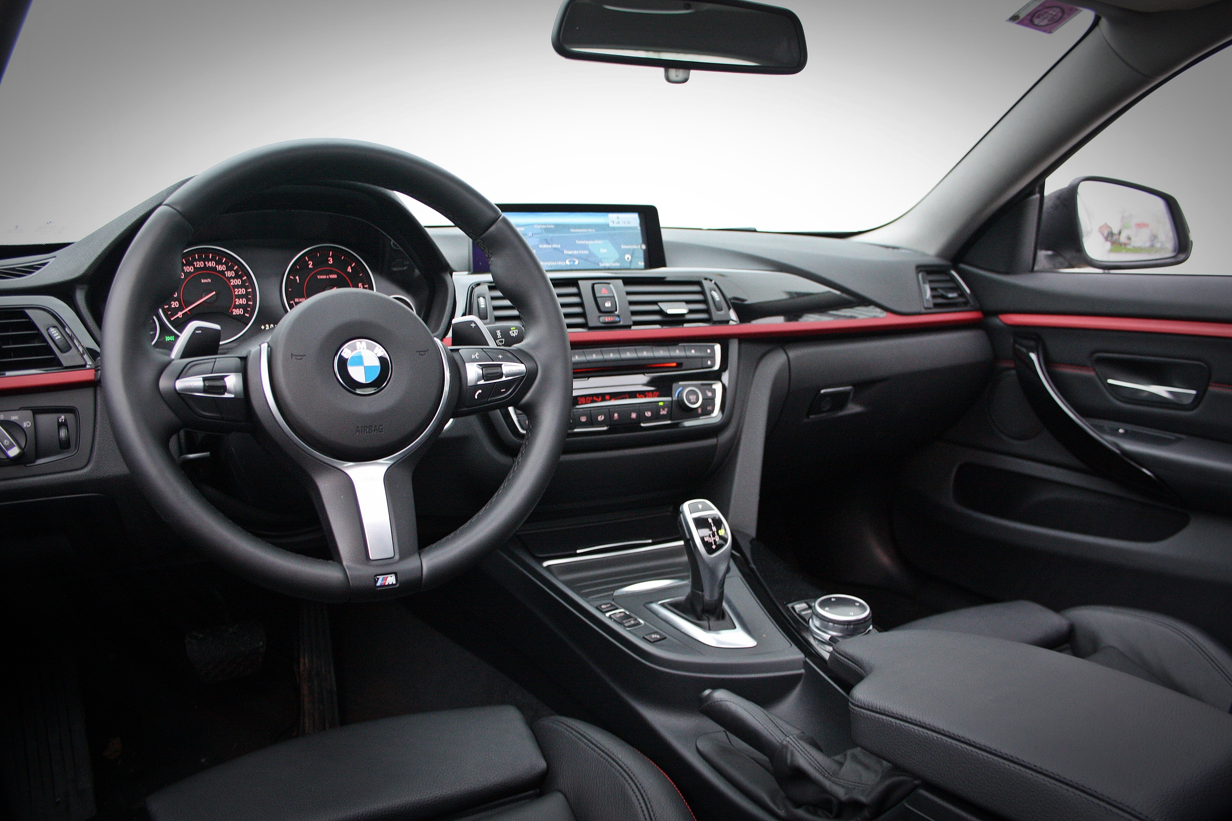 Enako zgodbo žal piše tudi notranjost, ki je sicer zelo mod(er)na in všečna na pogled in otip, je pa res, da je nivo prestiža tudi v gran coupeju v veliki meri povezan z globino lastnikove denarnice. Tesntik je premogel športna prednja sedeža in usnjeno oblazinjenje, ki lepo sovpada z notranjim M-paketom, katerega podpis najdemo na odličnem volanskem obroču, ki ga je tako užitek vrteti kot tudi gledati, enakega mnenja smo tudi glede osemstopenjske prestavne avtomatike, ki v ročnem načinu prestavlja bliskovito hitro. Poezija…voznikov delovni prostor je tako izrazito dinamičen, da bi zapisali športen pa so manjkale aluminijaste stopalke, ki so glede na paket opreme sport zanimivo da, ostale na seznamu doplačil. Glede voznega udobja se potniki ne bi smeli pritoževati, bi pa pri večji “obutvi” zagotovo prišla trdota vzmetenja, ki je skupaj s podvozjem izrazito na strani športnosti, zagotovo prišlo še bolj do izraza.