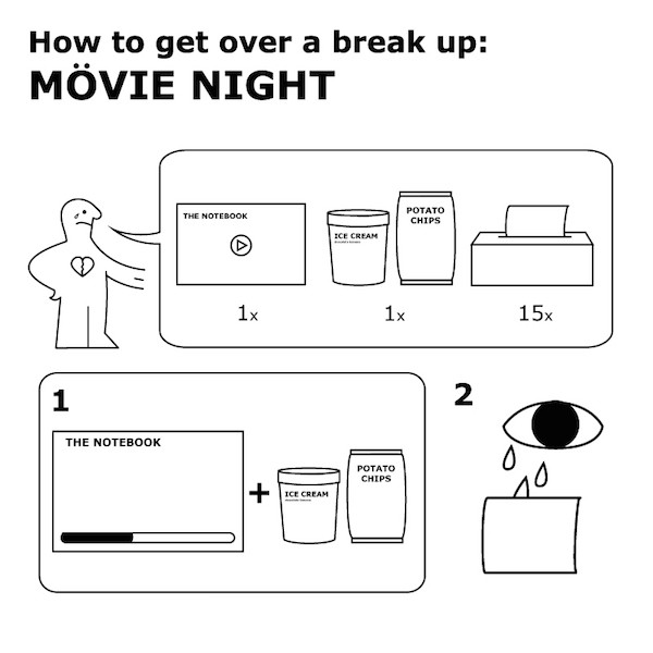 Cómo superar una rupturasi Ikea ¿Consejos de amor compartidos? Diseñador La casa de Nilaseca Ha diseñado una serie de formas de consolar un corazón inconsolable, inspiradas en instrucciones reconocibles Ikea para el montaje de muebles. Al igual que en este último caso, el proceso se describe de forma sencilla, explicando cómo hacerlo y qué se necesita.