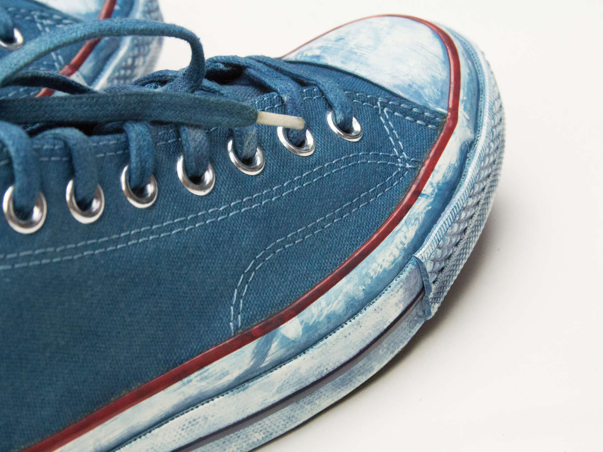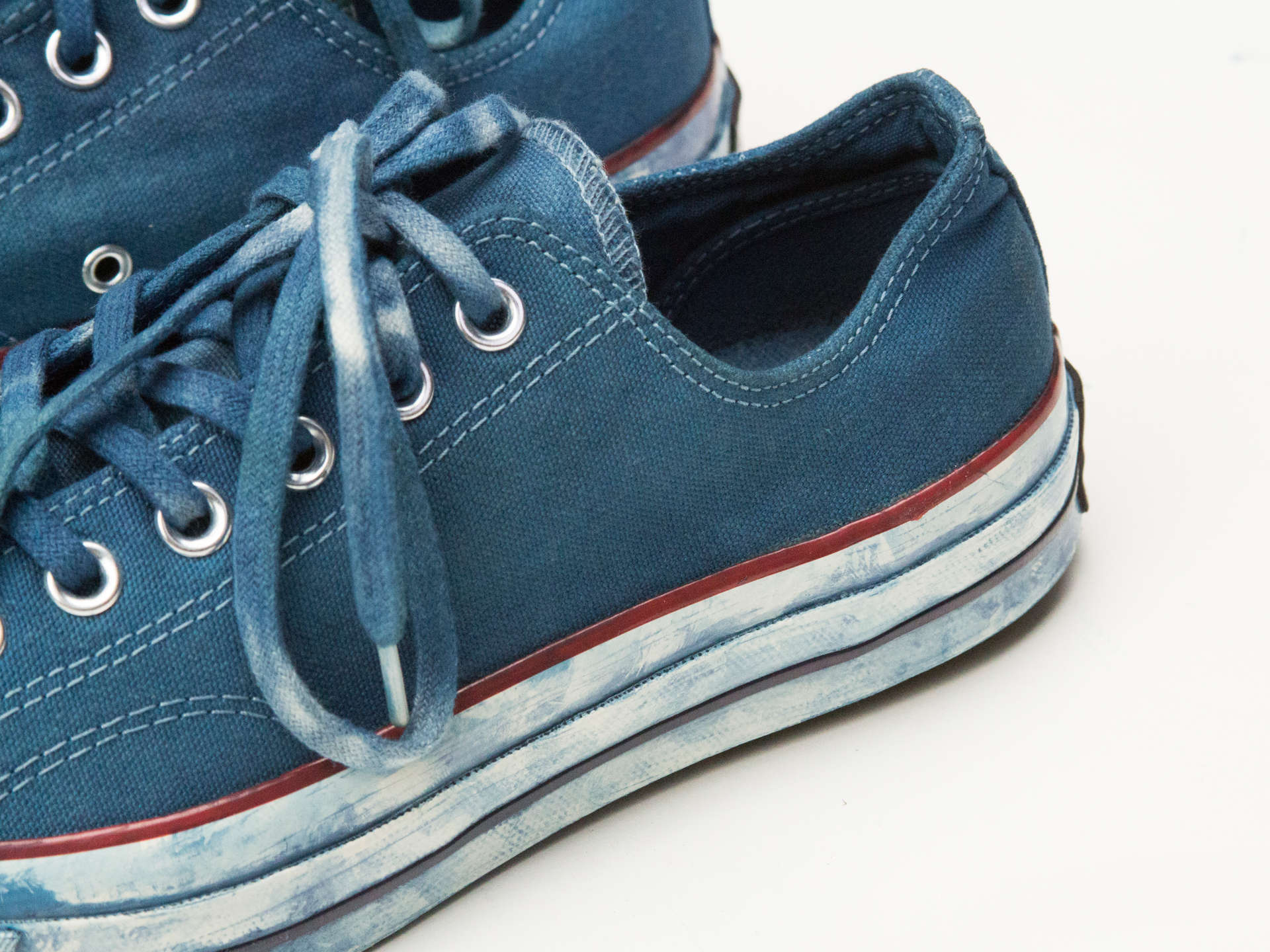 Diseñadores Traje de Nimes Tomaron 100 pares de zapatillas de Ámsterdam y las sumergieron una a una en tinte índigo natural. Se crearon ejemplares únicos Nuevas Chuck Taylor Indigo para niñas.
