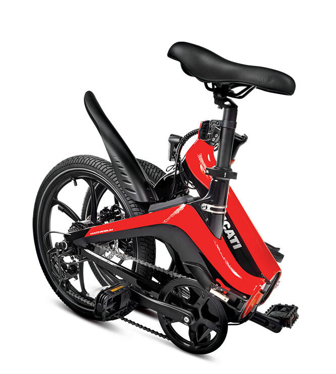 Ducati MG-20 es la primera bicicleta eléctrica plegable de esta marca italiana, más conocida por sus motocicletas rápidas y extremadamente potentes. La forma aerodinámica de la moto es ciertamente comparable a la forma de las motocicletas Ducati. La bicicleta MG-20 fue diseñada para andar en ciudad, ya que es ágil y liviana. El marco y las llantas están hechos de magnesio, que tiene un impacto significativo en el peso de la bicicleta, y el material exótico es duradero y soporta y absorbe bien los golpes.