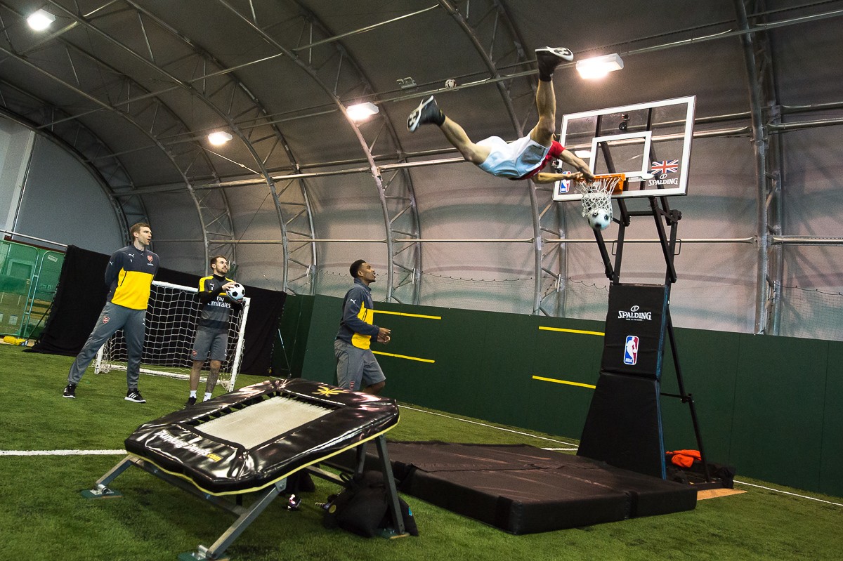 Representantes Artilleros, como también llamamos a los miembros del Arsenal, los Dunking Devils fueron vistos en el show del año pasado. Gran Bretaña tiene talento y los invitó a filmar un video promocional para un partido de la NBA que se realizará en Londres. 12 de enero de 2017. Los equipos se enfrentarán. Denver Nuggets y Indiana Pacers. En el vídeo participan tres jugadores del Arsenal: Aaron Ramsey, Per Mertesacker y Alex Iwobiy tres eslovenos. Sólo tenían 20 minutos para filmar, y durante ese tiempo realizaron un montón de trucos que combinan Los fundamentos del fútbol y el baloncesto y te dejarán sin palabras.