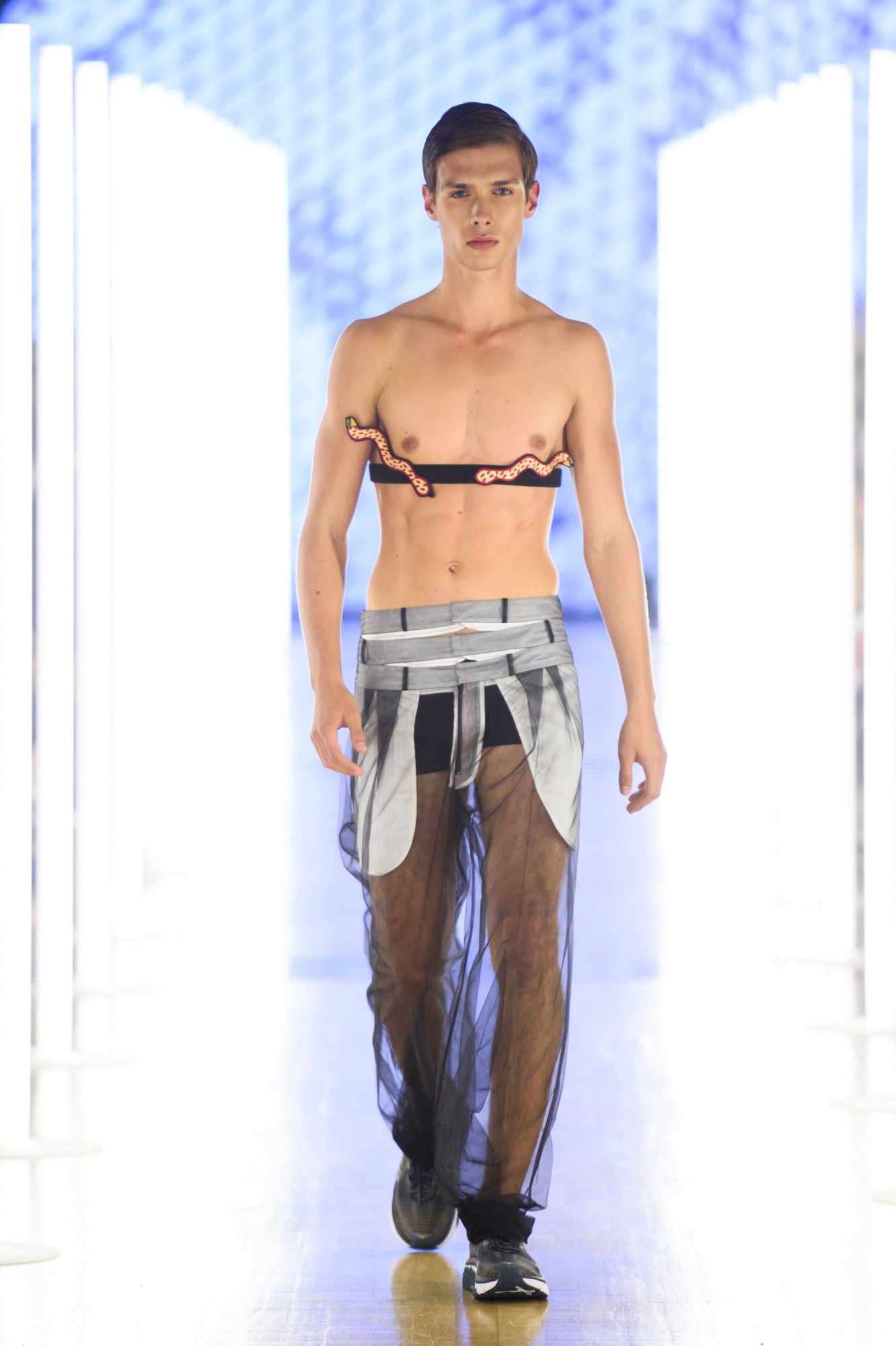 "La colección 17SS presenta una exploración del simbolismo y las propiedades físicas de las serpientes a través de cortes naturales, texturas, patrones, manipulación textil y siluetas de una manera humorística. La colección masculina coquetea con las obras de miembros controvertidos del movimiento. suite zoot con un toque moderno y detalles divertidos. ¿Tenemos miedo de estas esquivas criaturas porque no entendemos sus movimientos? ¿Frío al tacto, desagradable estructura escamosa de la piel, colores de advertencia o de camuflaje? ¿Cultivamos una aversión a todo lo que no sabemos o no entendemos mejor? ¿O tal vez sólo tememos las similitudes individuales con esas "serpientes" que llevamos en nosotros y percibimos en los demás?