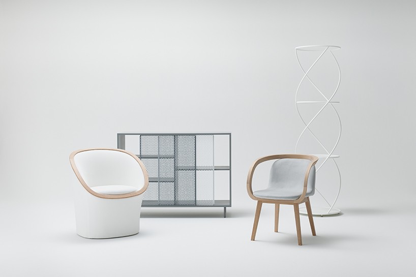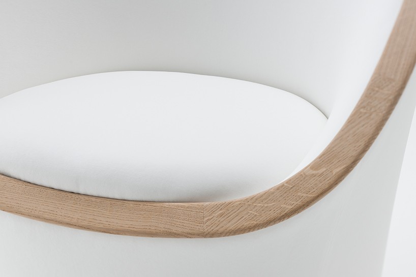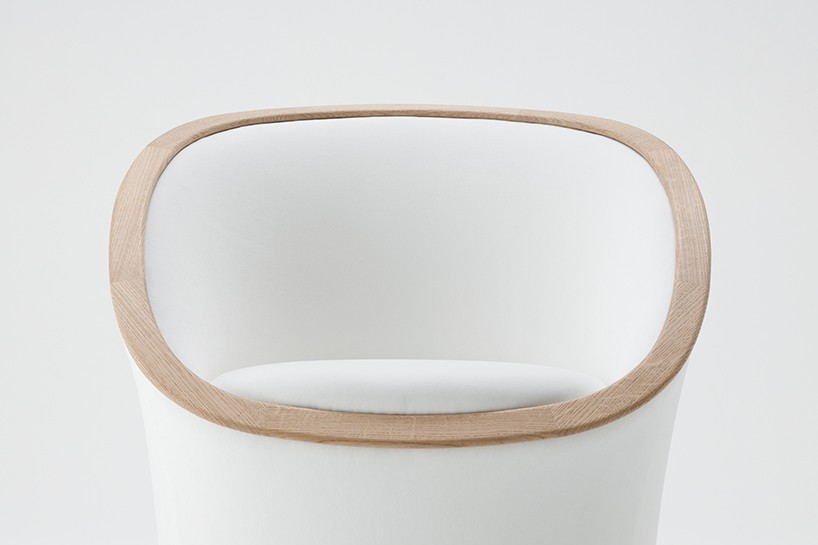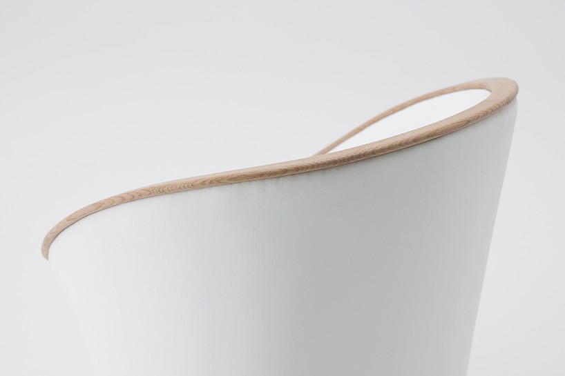 Estudio japonés Junpei Diseño Tamaki él diseñó la silla "sofá deshielo", que se inspiró en la nieve. Una silla blanca minimalista formas suaves, cuyo principal foco visual es la cenefa de roble, que dibuja una línea suave. estan en serie dos derivados de la silla, en el primero las piernas se unen en una gran formación blanca masiva, mientras que el otro es más luminoso y aireado, al que también contribuyen 4 elegantes patas de madera.