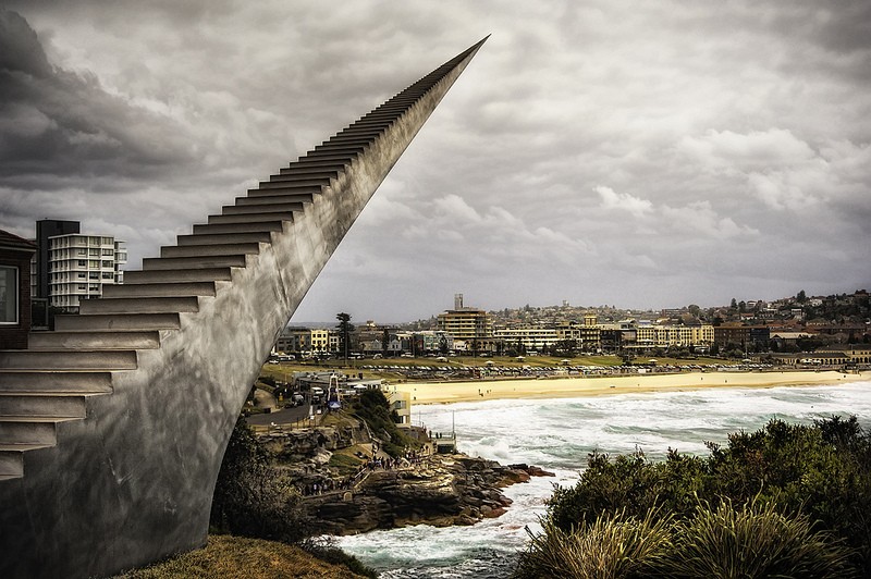 el mas grande de este año evento de escultura contemporánea en el mundo abarcó un tramo de 2 km entre Bondi y Tamarama. Entre más de 100 obras internacionales, la inspiradora creación del artista atrajo la mayor atención. David McCracken con titulo “Disminuir y Ascender”. En su escultura juega con las perspectivas, teniendo en cuenta los efectos visuales de simular la distancia. La construcción de la escalera de aluminio, que se hace cada vez más pequeña a medida que asciende, ofrece así la ilusión de un camino al infinito de las nubes de la imaginación.