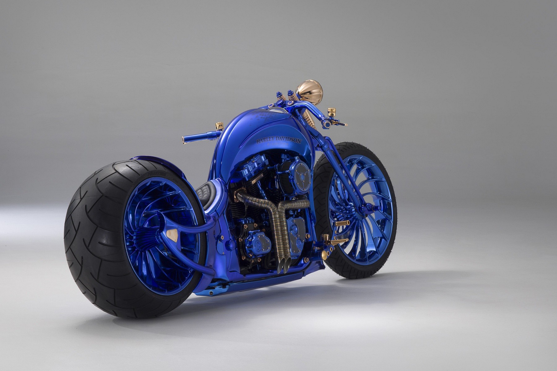 La Softail fue completamente 'desmontada' y puesta nuevo componentes dibujados en un estilo retro-vintage. Bien todo el mundo la pieza de metal recién añadida se fabrica, mecaniza, suelda, rectifica y pule a mano. Incluso rediseñaron el marco de la motocicleta y le agregaron más. ancho llantas y neumáticos. Una ventana en el motor revela un árbol de levas giratorio, y también podemos ver las válvulas doradas, que están iluminadas por CONDUJO-brillaba, resistente a la fiebre Solo un vistazo rápido a la motocicleta le dirá que tiene mucho a su favor. dorado componentes y no solo piezas de motor de oro. El asiento está hecho de alguna manera. a mano fabricado en piel de vacuno suiza.