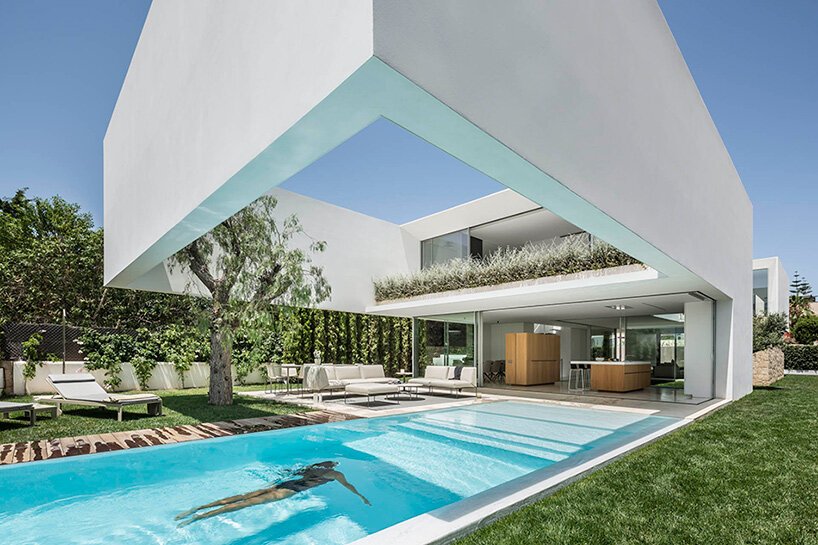 En la parte trasera de la casa, sobre la piscina, se encuentra una estructura dinámica en voladizo que brinda privacidad y protección contra el sol de verano. Hay espacios habitables en el baúl, por lo que la sala de estar está cerca de la entrada y la cocina y el comedor se fusionan con la terraza en la parte trasera. Las puertas corredizas de vidrio permiten ampliar el espacio interior para incluir la piscina y la sala de estar adyacente durante los meses más cálidos. La planta superior es más cerrada e incluye cuatro dormitorios. Una escalera conecta las plantas superiores con el sótano, donde se encuentran el garaje, el gimnasio y el lavadero.