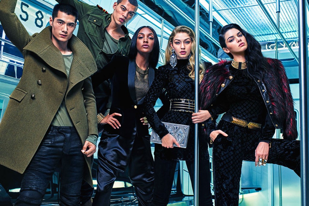 supermodelos Gigi Hadid, Kendall Jenner y Jourdan Dunn son las protagonistas de la campaña de moda más esperada de este año. Las famosas bellezas posaron vestidas en compañía de los modelos masculinos Haa Yun Xiang y Dudley O'Shaughnessy. H&M X Balmain, diseñado para el magnate sueco por el diseñador de moda francés de 28 años y director creativo de la casa de moda Balmain. Olivier Rousteing. La campaña urbana, que revela que hasta las supermodelos viajan en metro, fue realizada por el icónico fotógrafo Mario Sorrenti.