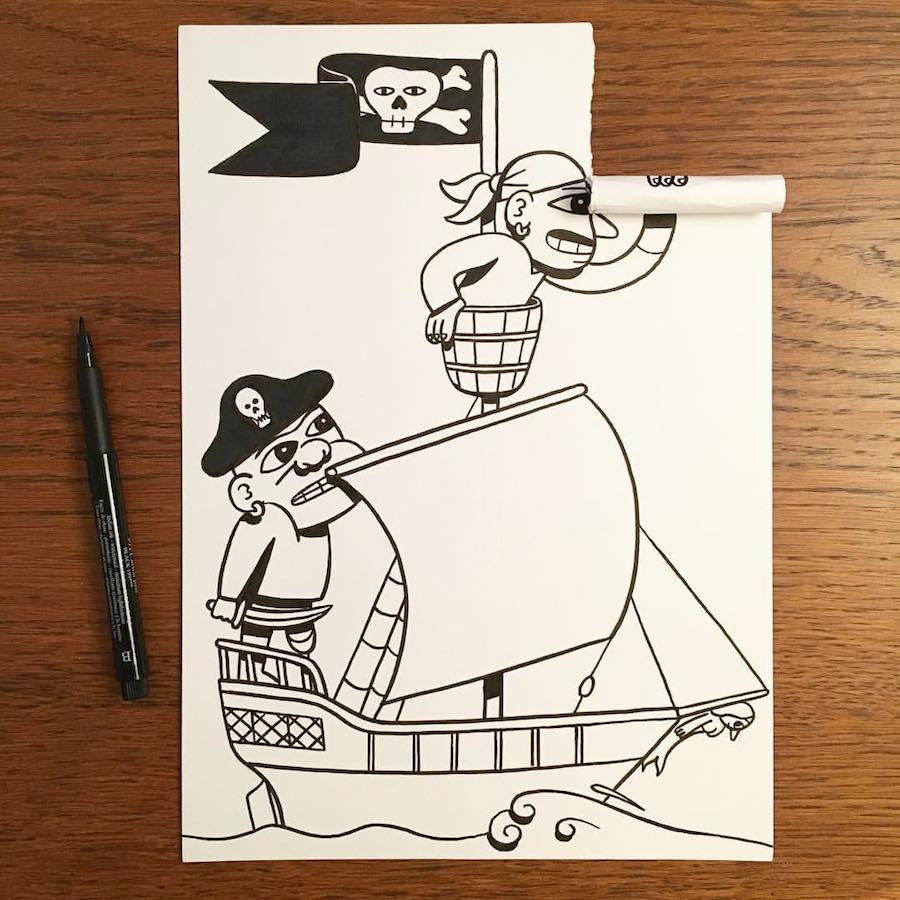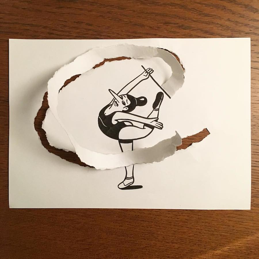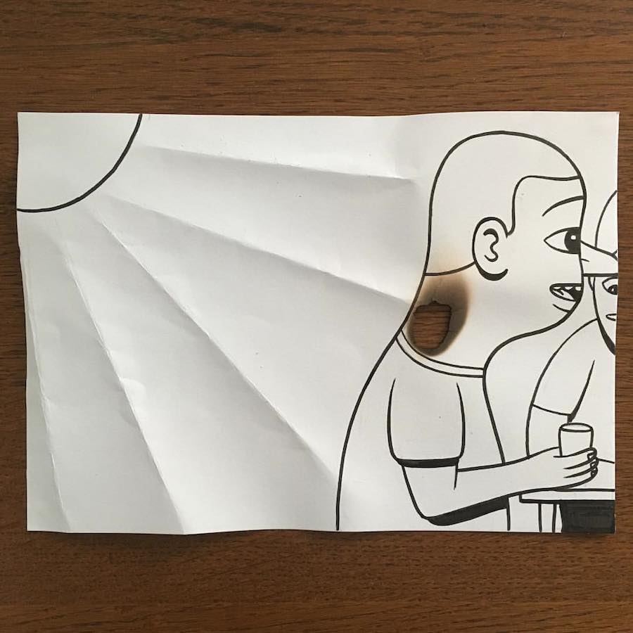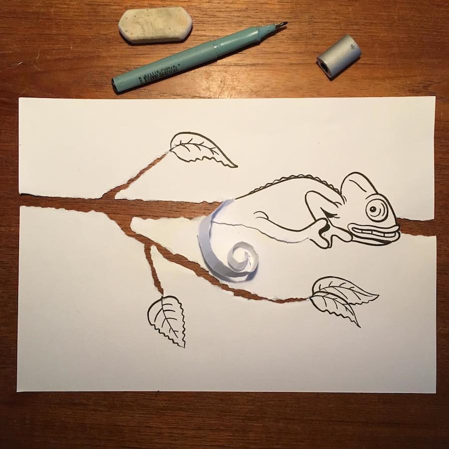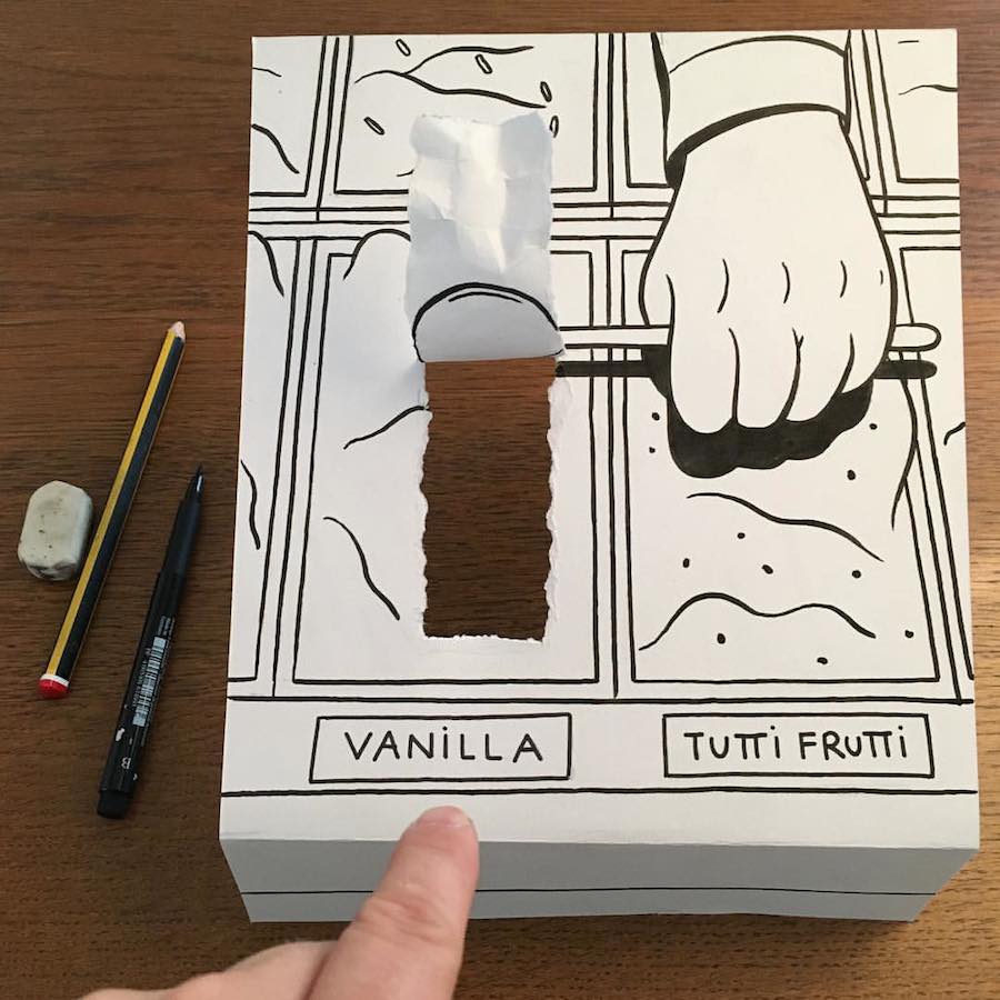 El artista danés HuskMitNavn solo necesita una hoja de papel en blanco y un bolígrafo para sus creaciones. Cortando y doblando papel dibujado con ilustraciones, crea sorprendentes efectos 3D que dan vida a las ilustraciones.