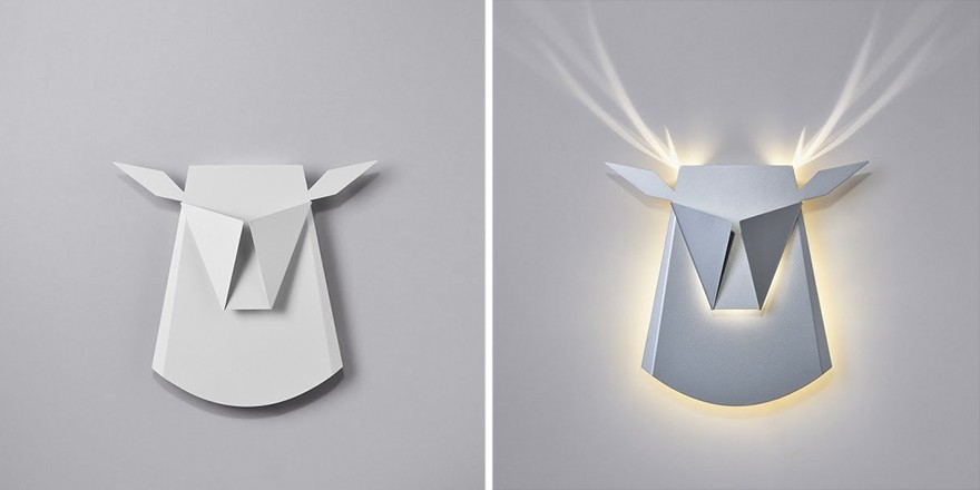 Diseño minimalista juegan con la luz y cuando se enciende la luz, iluminan el fondo de tal forma que, en combinación con la propia lámpara, se convierten en un animal. Los motivos de cabeza de venado y pavo real están disponibles, y Bikovska tuvo la idea de los libros emergentes, que siempre la fascinaron cuando era niña. Una versión está disponible de cartón, lo que te facilitará 60euros, versión de aluminio y por 235 euros.