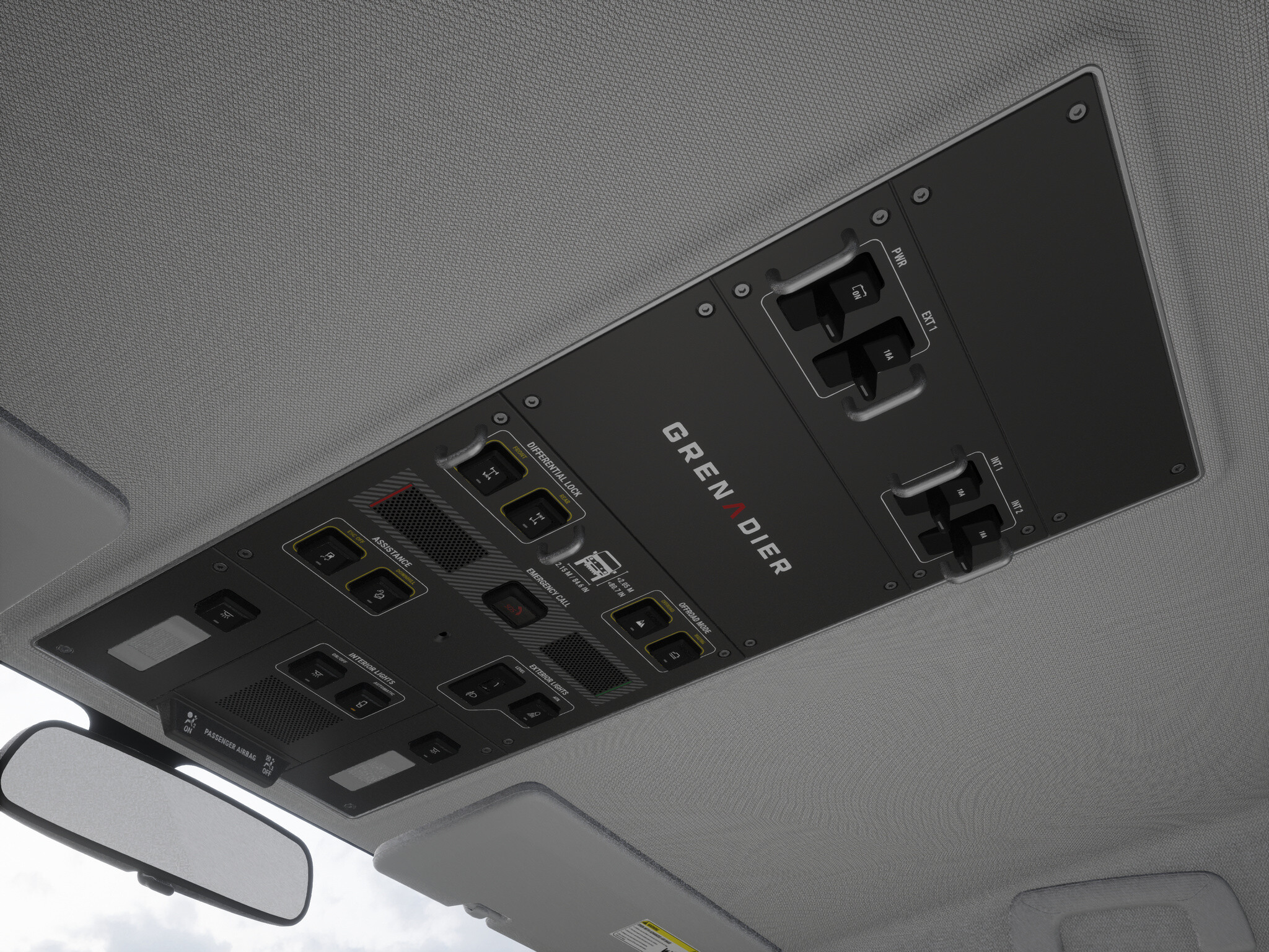 Granadero está diseñado para la conducción todoterreno y sus características exteriores reflejan esa intención. La iluminación exterior permite la instalación de iluminación auxiliar, que también es opcional listón utilitario con un sistema universal de fijación a la puerta.
