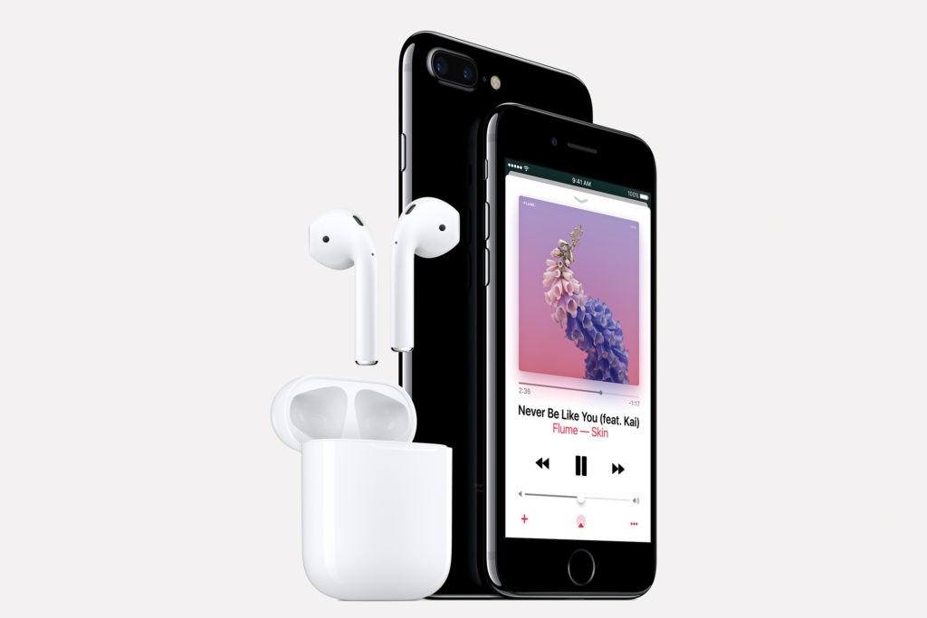 A cambio de una carcasa más fina, Apple se deshizo del clásico Conector para auriculares de 3,5 mm – los auriculares se pueden utilizar a través de Apple en su lugar Conector relámpago (su equivalente en el mundo Android es micro USB) o a través de una conexión inalámbrica. En este sentido, Apple también presentó auriculares inalambricos airpods (precio 159 dólares estadounidenses), que están equipados con un chip W1, que se encarga de la conexión entre el dispositivo y los auriculares. La autonomía de los auriculares es cinco horas o 24 horas cuando se usa el estuche de carga. Los usuarios que prefieran utilizar sus antiguos auriculares, es decir, los que tienen conexión analógica, podrán utilizarlos convertidor especial señal que Apple agregará a cada iPhone 7.