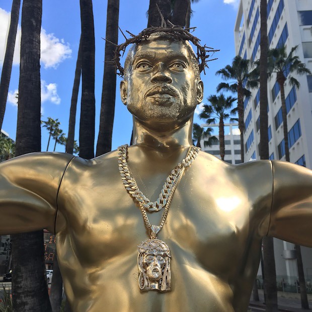 Kanye West je v Los Angelesu dobil zlati kip, kjer je kontroverzni raper, ki je nedavno zaradi pregorelosti utrpel psihični zlom, upodobljen kot Jezus Kristus na križu (brez križa). Kip je delo anonimnega uličnega umetnika z umetniškim imenom Plastic Jesus, Kanye pa stoji na prstih na piedestalu s podpisom ”False Idol” (v prevodu lažni idol).