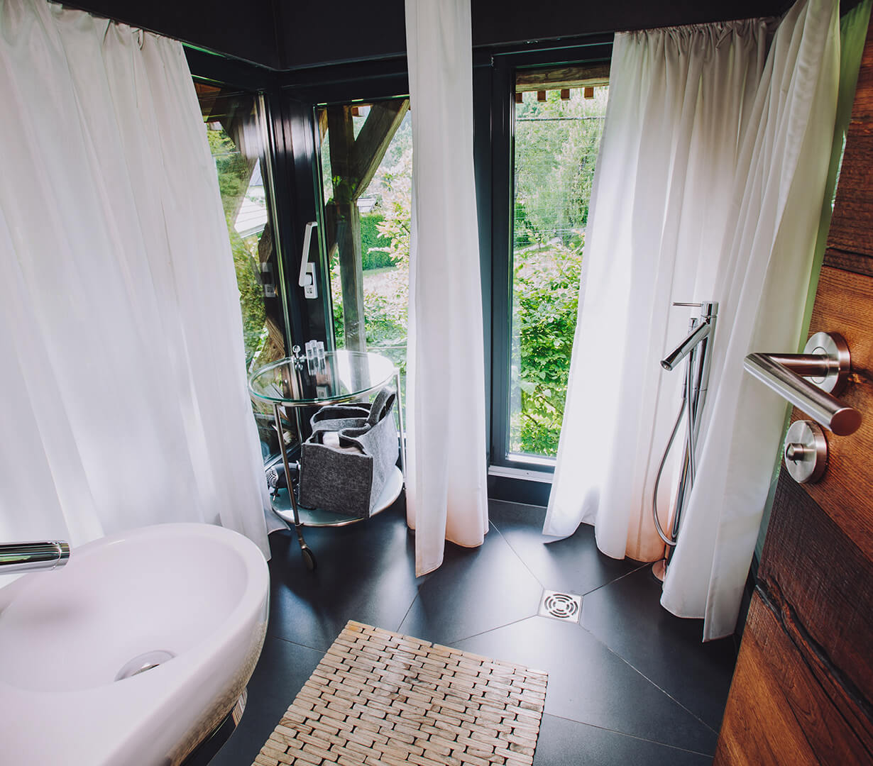 Es el cielo cuatro cabañas para dos, atrapadas en una terraza mirador entre el cielo y la tierra. Un privilegio para cuatro parejas, casi mil metros sobre el nivel del mar, con vistas a los picos de los Alpes Julianos, el Parque Nacional de Triglav y la esmeralda Soča en el valle. Sobre todo, el cielo ofrece el lujo de la paz. Íntimamente en medio de la naturaleza. Donde los únicos vecinos son cuatro parejas de ciervos. Donde grandes paredes de vidrio dan la sensación de que estás afuera, que estás flotando entre el cielo y la tierra, que eres parte de las majestuosas montañas. Es como sentarse en un sofá en medio de la naturaleza salvaje: verde en verano, flores de montaña en primavera, tonos cobrizos dorados en otoño y blanco en invierno. También vale la pena señalar que el Cielo también ganó Certificado medioambiental Travelife Gold.