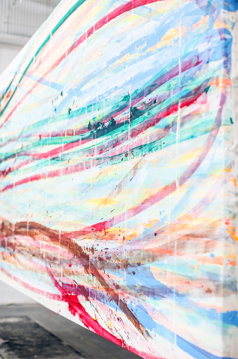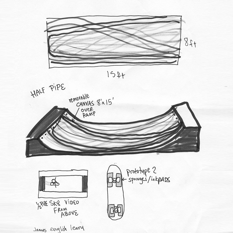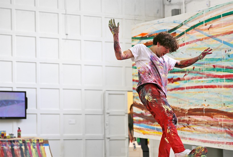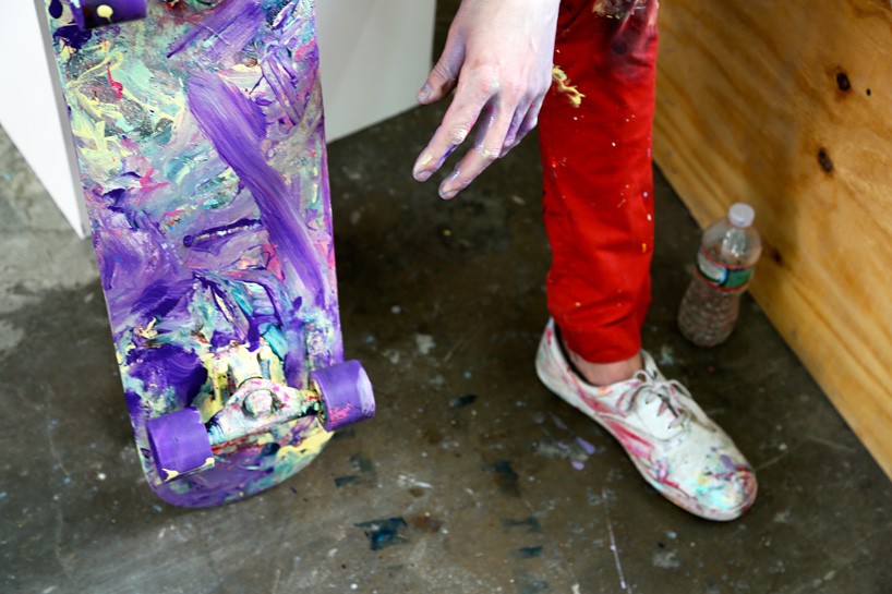 Uporabil je tehniko pripenjanja gobic na skejt. Te je med skejtanjem pridno pomakal v lončke z barvo, končni izdelek in sam proces pa si lahko ogledamo v galeriji. Unikatno, ni kaj!