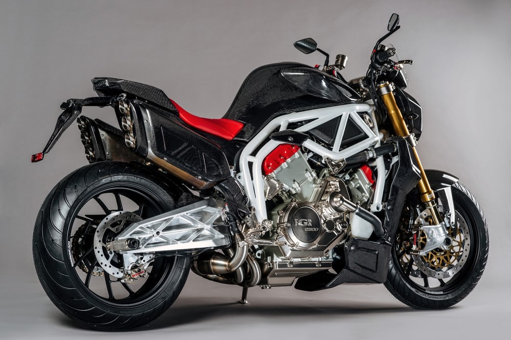 Sin armadura Midau, que creció en el césped en 2004 Miroslav Felgra, que quería una moto deportiva grande, presume con 240 caballos de fuerza (160 Nm de par), giro de 90 grados para servicio pesado unidad V6, suspensión Ohlins, discos de freno premium Brembo, estructura tubular Conducción (razón por la cual es ágil y estable al mismo tiempo), suspensión trasera de aluminio técnicamente sofisticada y seis escapes.
