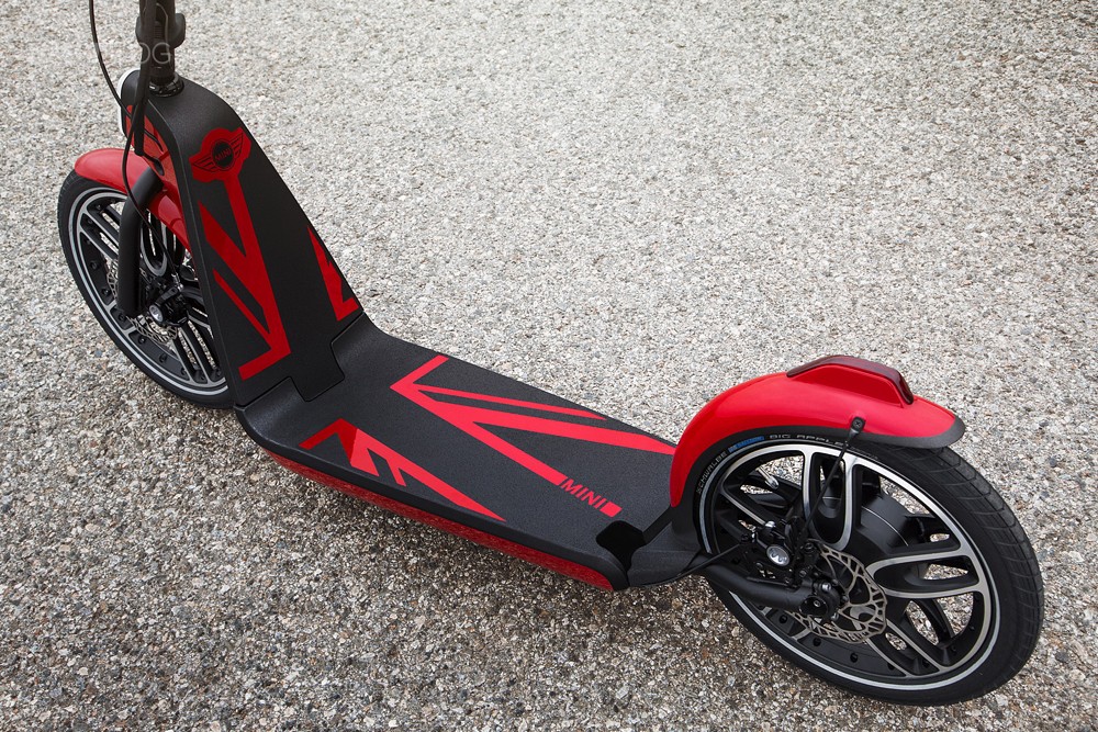 Una moto no tiene engranajes, es fácil de controlar (marco estable, ruedas grandes con rejillas de ventilación, plataforma baja para caminar y manillar regulable en altura), accionado por el buje trasero y accionado manualmente. Puedes moler con él hasta 25 km/h, el motor para arranca solamente después de que nosotros mismos lo empujamos lo suficiente. Es decir, como cuando el auto no arranca y tienes que "patearlo" en el trasero. La energía se almacena en baterías de iones de litio, que está oculto en un cuerpo que se parece mucho a un Mini real. Se alimenta a través de enchufes de 12 voltios para coches o enchufes para hogares, así como a través de regeneración de energía de frenado, cuando se activa uno de los tres sistemas de frenado. Nos trae en un "shub" y sin imitar a los Kremenčkov de 15 a 25 kilómetros lejos.