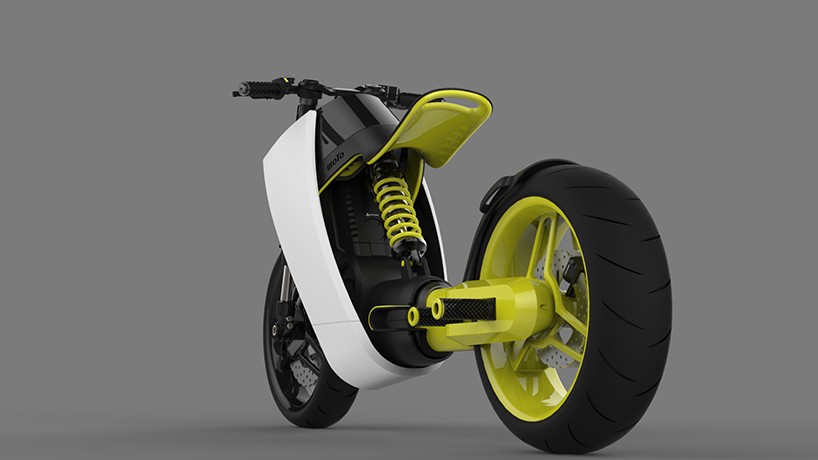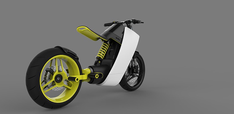 Concepto negro-blanco-amarillo moto moto israelí amir elias es su proyecto final de carrera de ingeniería y diseño. En ciudades que están abarrotadas y atrapadas regularmente en atascos de tráfico, esta forma de transporte es más que bienvenida, ya que ofrece transporte no solo para uno o dos, sino para a tres personas.