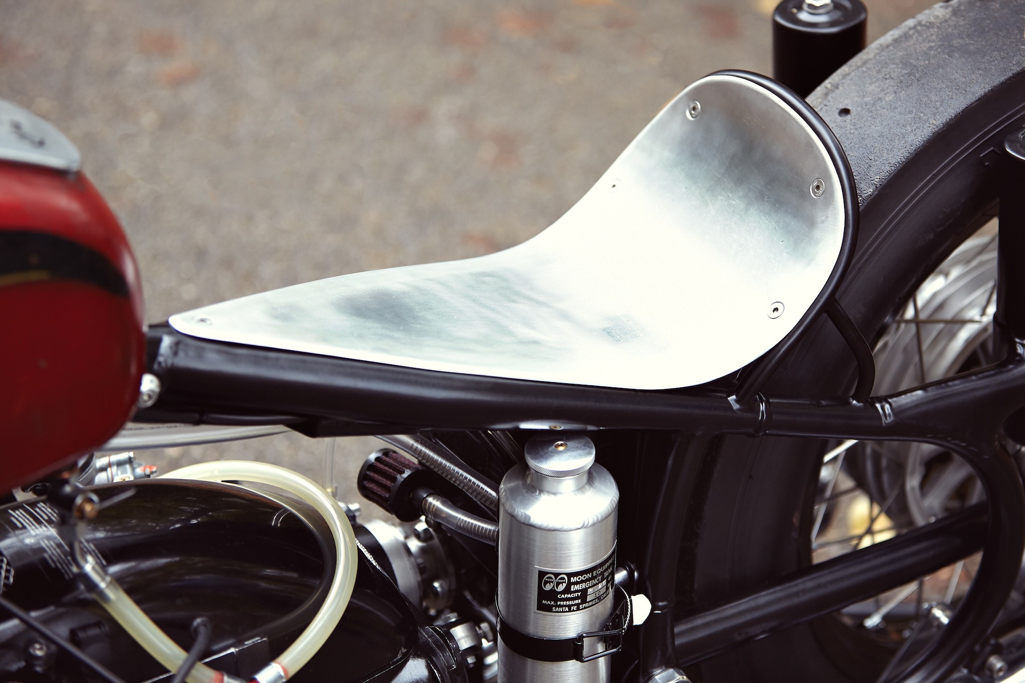 Que son "bicicletas de arrastre" Sprintbeemer a Garaje del gato de la suerte Preparado para carreras, las horquillas delanteras fueron retiradas de la construcción original y reemplazadas por las de una motocicleta BMW. R75/5. De lo contrario, toda la motocicleta está lista. de diferentes partes, lo que hace que parezca que lo armaron a partir de cosas que encontraron por ahí. Diseño frontal revestimientos aerodinámicos Es obra de Benny Robinson, director creativo de Edwin Europe, y detrás el acento lo pone la vintage "J. Lojevska" Neumático M&H de 18 pulgadas, que lució la bicicleta de Morado.