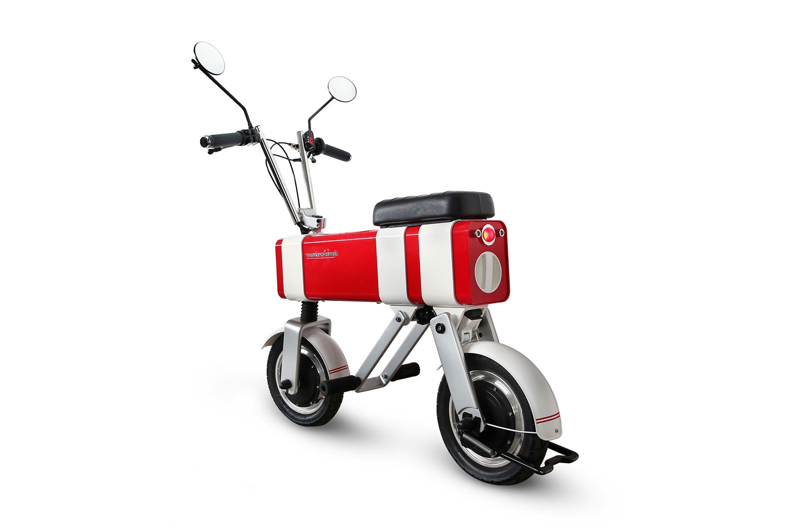vespa del metro con una distancia entre ejes de 75 mm mujer batería de iones de litio, que se carga en una hora a través de la conexión de casa y nos transporta a la carga 60 kilómetros lejos Motor 40V 350W sin embargo, Motochimp se puede conducir a gran velocidad 30 km/h. Soporta sin contacto llave rfid (identificación por radiofrecuencia), lo que asegura que el motor no tenga piernas. Tendrás que desembolsar aprox. 1800 euros.