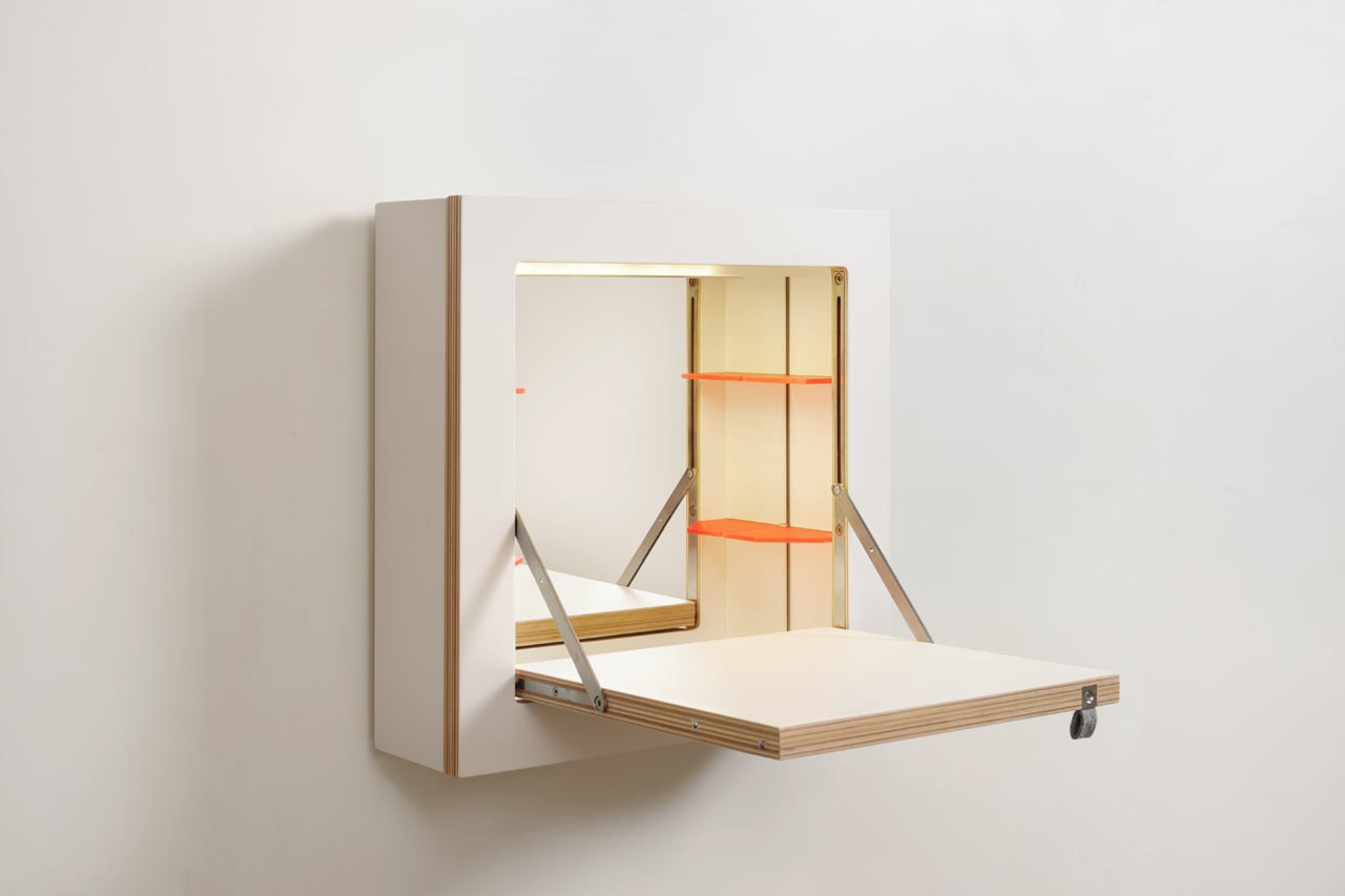 El armario Schminktank se caracteriza por su alta funcionalidad, su polivalencia, su diseño moderno y sus pequeñas dimensiones. Simplemente lo colgamos de la pared, donde queda cerrado casi imperceptiblemente. Al abrirlo tenemos un lugar para trabajar, y el mueble también puede servir como minibar o mueble para primeros auxilios o almacenamiento de maquillaje, ya que además del espacio de almacenaje, podemos encontrar en él una luz y un espejo. .