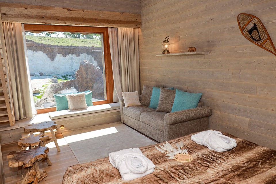 En el zoo belga Pairi Daiza han organizado un resort con 50 habitaciones o apartamentos, donde estás separado de morsas, pingüinos, tigres siberianos y osos polares solo una pared de vidrio! Algunas habitaciones incluso ofrecen una vista "submarina", lo que significa que puede seguir a los mamíferos mientras buscan presas o simplemente nadan.