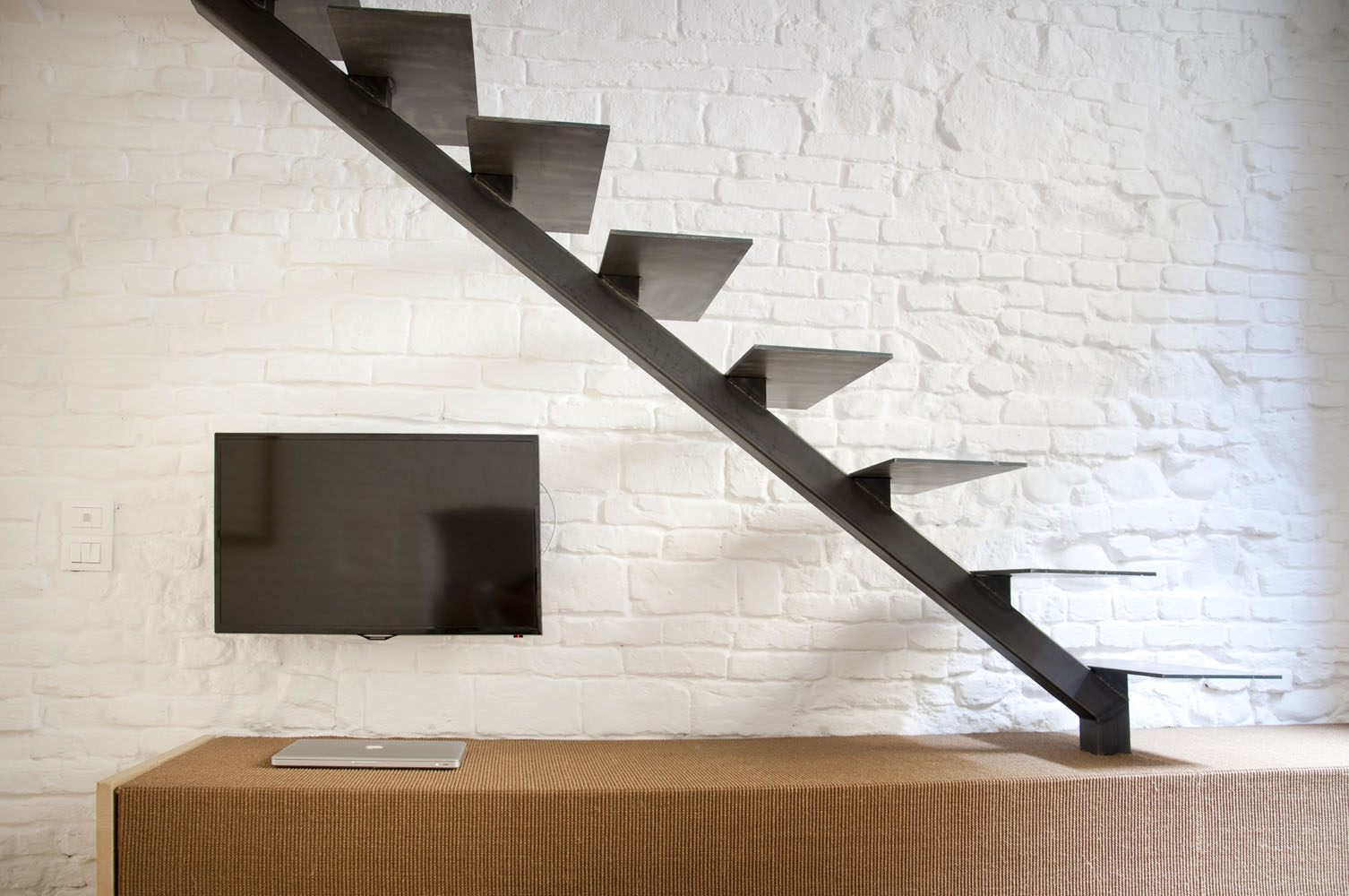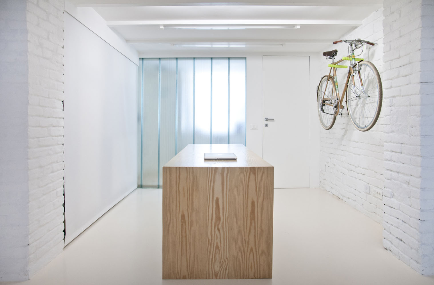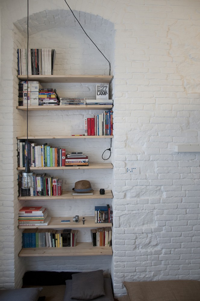 Porque tiene un apartamento pequeño y minimalista, antigua tienda, v Turín con solo dos ventanas, los arquitectos pintaron las paredes del apartamento en blanco, aumentando así ópticamente el espacio y la luminosidad de la habitación. marcan el espacio ladrillos de pared de color blanco y minimalista de madera mueble. Debido al área pequeña, hay espacio extremadamente utilizado. En la planta baja apartamentos hay una pequeña cocina, un baño y una zona de estar, y en la galería hay una pequeña zona de trabajo y un dormitorio separados por una cortina.