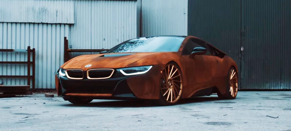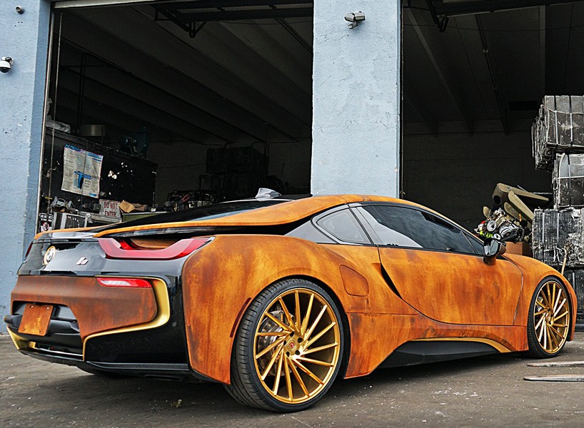 La oxidación en los coches modernos es poco frecuente, así que quizá te preguntes cómo pudo oxidarse un coche de lujo como el BMW i8. De hecho, los bávaros hicieron un buen trabajo, ya que el coche no está oxidado, sino simplemente envuelto en una lámina impresa de color óxido. Así que no es una lata vieja, sino un caballo de acero de 100.000 euros, con llantas Vossen doradas.