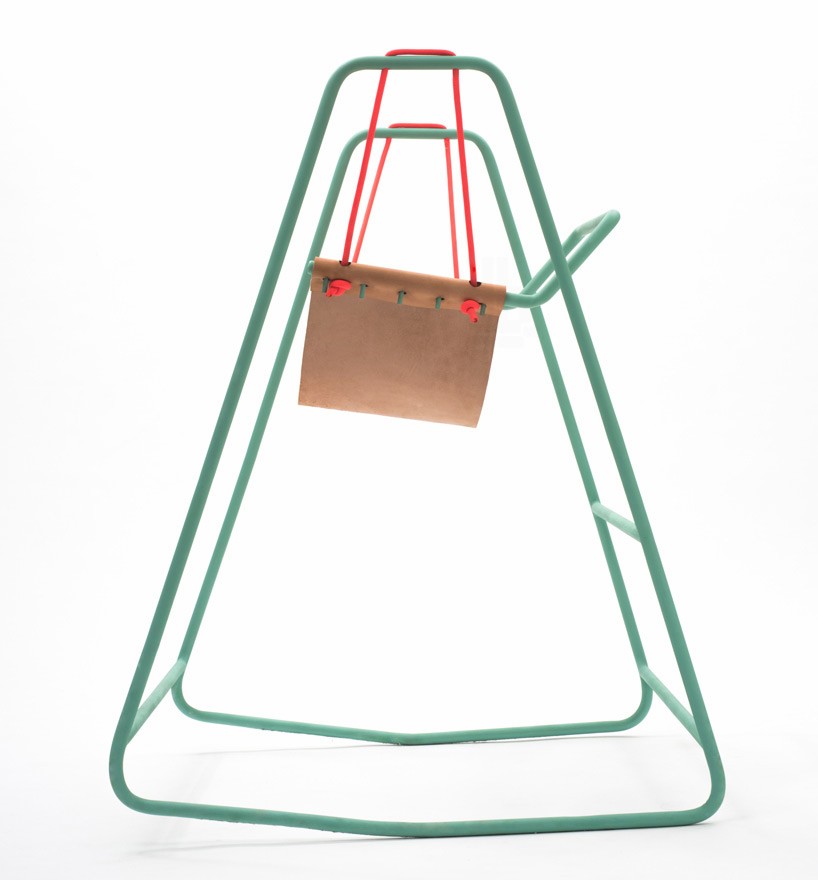 “Rocking Chair” je ultimativno orodje za medgeneracijsko zabavo, igriva kombinacija otroške gugalnice in babičinega gugalnika, ki nas nežno ziblje in igrivo guga. Minimalistično oblikovan pohištveni kos, ki govori dva jezika – gugalnice in gugalnika – je sestavljen le iz bistvenega – železnega okvirja, usnjenega sedeža in vrvi, brez vijakov in nepotrebnih zunanjih elementov. Lahkoten in mobilen, je pohištveni kos “Rocking Chair”, ki ga odlikujejo čiste linije in živahne barve, pravi nomad, ki nežno ziba, ko to najbolj potrebujemo.