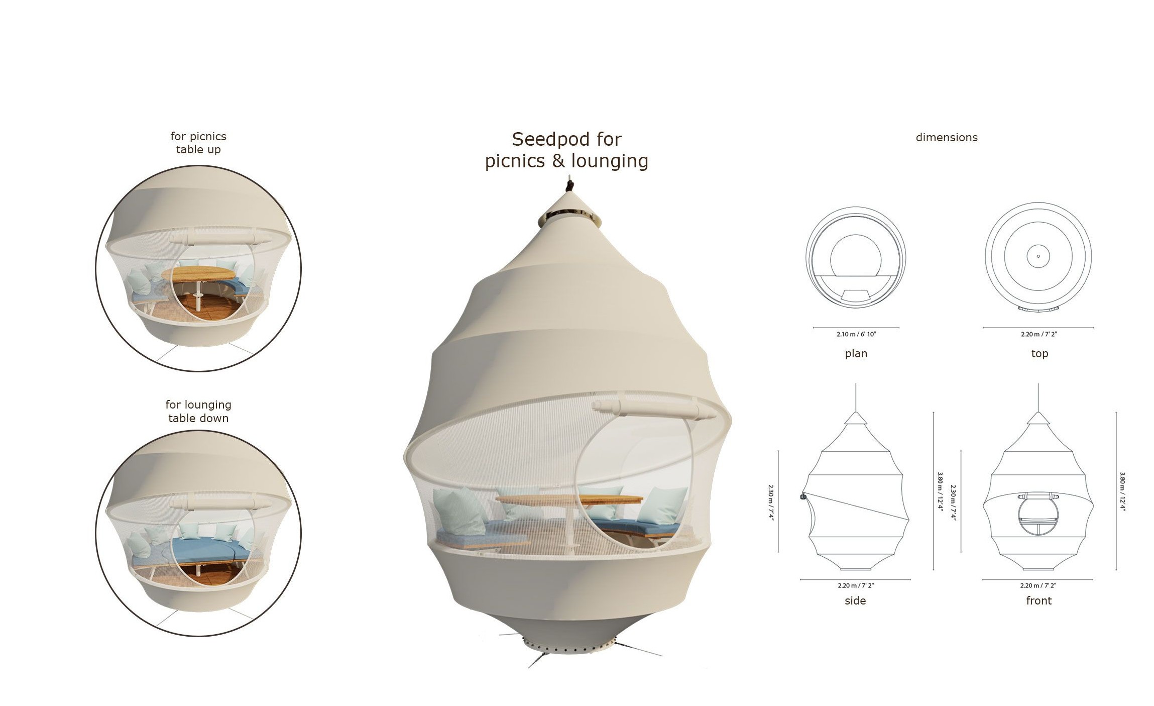 capullo o carpa en forma de semilla (como su nombre indica) se puede colgar de un árbol o colocar sobre un pedestal. está equipado con iluminación, ventilador de techo, mini nevera y Estación de carga para dispositivos, lo que lo hace ideal para instalarlo a lo largo de rutas de senderismo, campamentos de surf o en un safari.