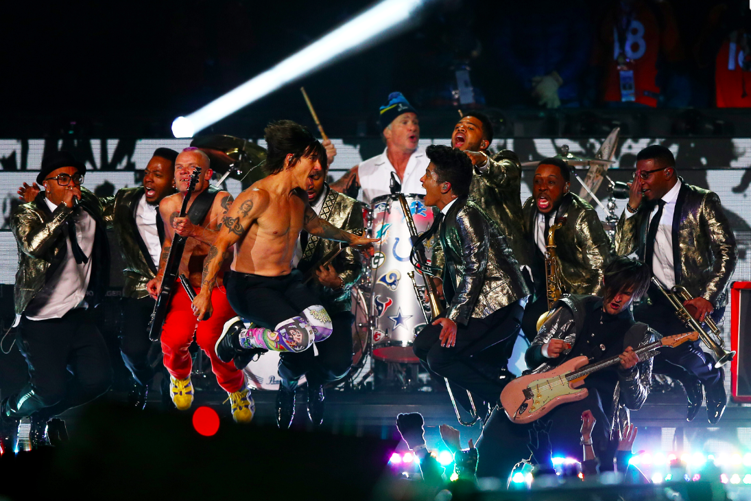 S surrealno uvodno špico sponzorja polčasa, blagovne znamke Pepsi, pa se je skoraj 14-minutni, težko pričakovi šov lahko pričel. Že takoj na začetku je bruno marte v izjemnem slogu prinesel udarni solo na bobnih, ki ga je nadaljeval z energično koreografijo v stilu Jamesa Browna skupaj s svojim bandom na najnovejši uspešnici “Locked Out of Heaven” in “Treasure”. Karizmatičnemu pevcu v zlatem suknjiču so se nato pridružili odlični rock veterani Chiles rojos Picantes, ki so z osveženo verzijo njihove uspešnice 90. let “Give It Away” še dodatno podžgali goreče vzdušje in popolnoma zavladali skakajočemu občinstvu. Sledil je čustveno nabiti zaključek s posvetili ameriških vojakov na misijah po svetu in spektakularnim ognjemetom ob ritmih romantične “Just The Way You Are".