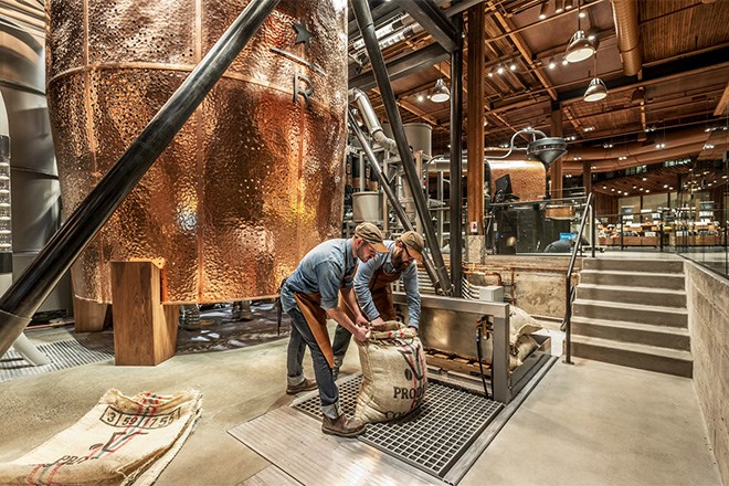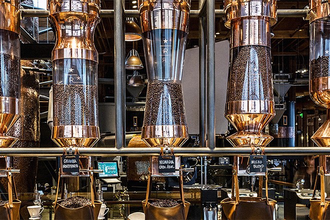 la barra mas nueva starbucks, que fue inaugurado en Seattle, es su mayor hasta ahora. Se extiende en algo menos de 1400 m2, y se trata de verdadera fábrica, donde se le da un toque de equipamiento industrial en combinación con muebles fabricados en madera de nogal. Se estiran en el espacio dos cafeterías, una tienda, un restaurante, una biblioteca en dos plantas con más de 200 títulos de libros y una fábrica, tostadora de café. Todo bajo un mismo techo en el área de Capitol Hill de la ciudad. En la tostaduría planean producir ingentes cantidades de café, con el cual suministrarán apenas 23.000 pequeños cafés. Con el nuevo espacio, la corporación ofreció una idea de su método de producción, que se puede observar detrás de la barra de lujo o cómodamente reclinado en el sofá mientras hojea un libro.