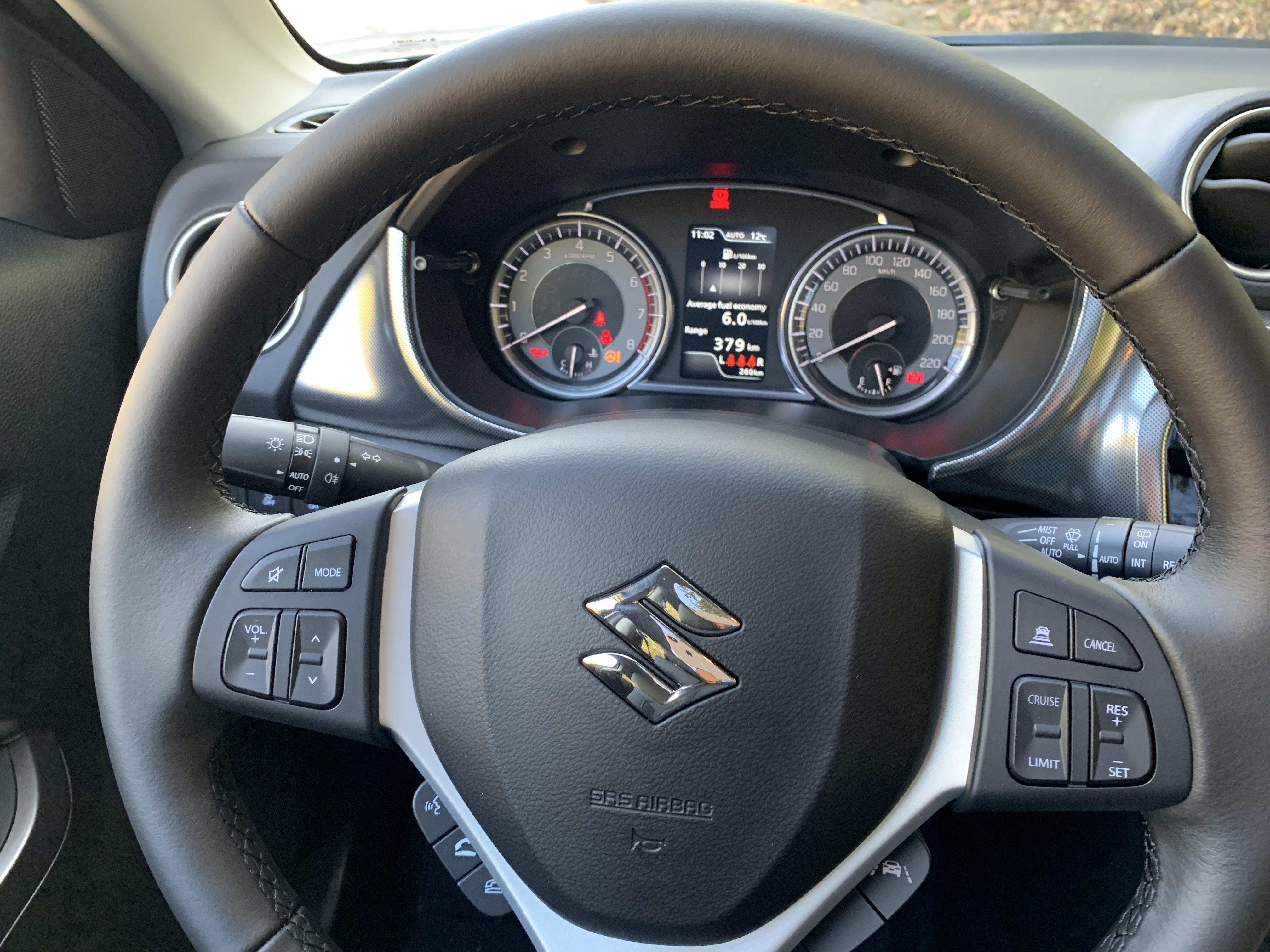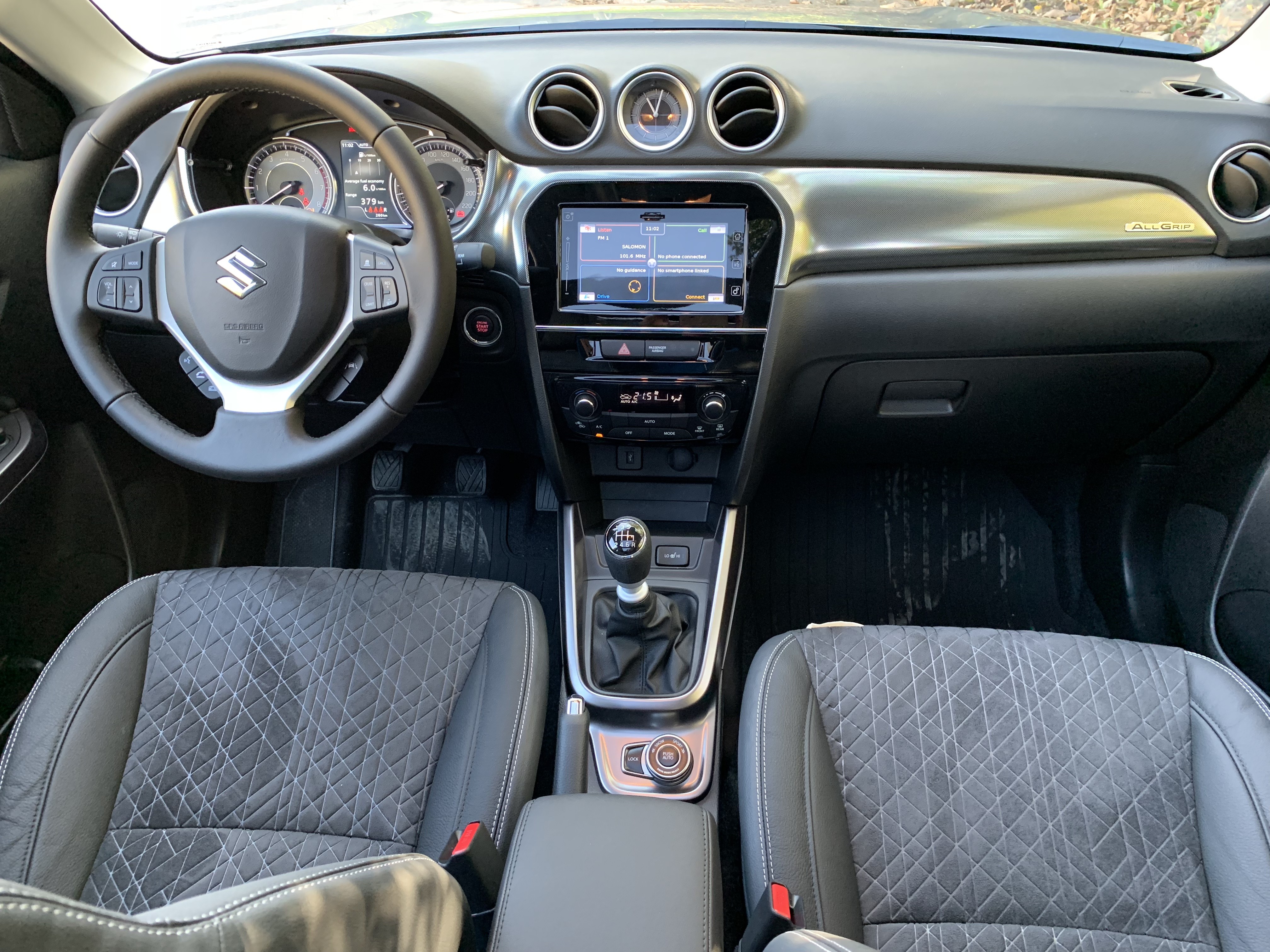 El Suzuki Vitara recibió cambios importantes adentro. Lo estamos presenciando por primera vez en Suzuki plásticos blandos en el tablero, y todavía tenemos uno nuevo disponible tapicería, que comprende la combinación cuero y alcántara en equipamiento Elegance. El reposabrazos central ahora se ha convertido en parte del equipo estándar de cada Vitara. es nuevo y actualizado 4,2 pulgadas pantalla a color, que se encuentra entre el tacómetro y el velocímetro.