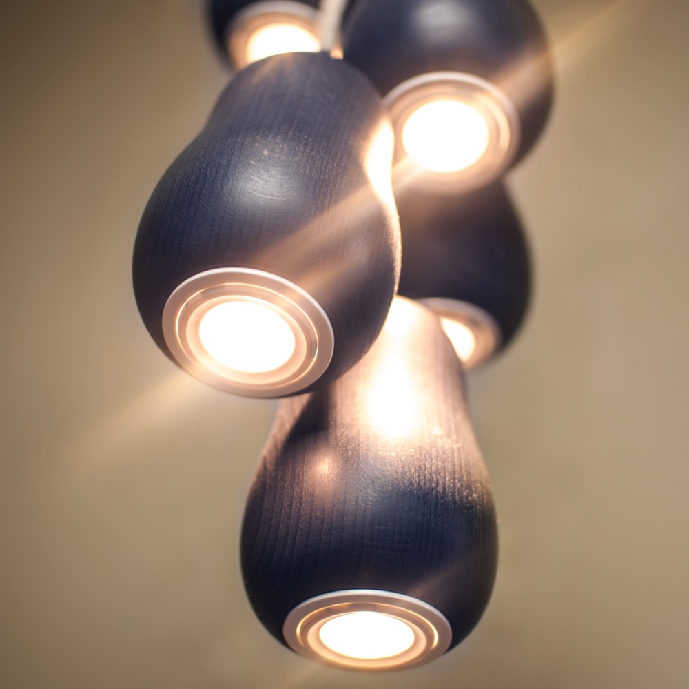 Minimalistični diseño namiznih in stropnih svetil lahko uporabimo kot edini vir svetlobe ali kot množico, ustvarjajoč svojevrstno skulpturno umetnost. Njihove čutne zaobljene oblike spominjajo na čutnost ženskih oblin, ki harmonično sovpadajo z obliko žarnice v notranjosti. Toplo očarljivost naravnega oddaja plašč bukovega in hrastovega lesa, s porcelanosto belimi detajli.