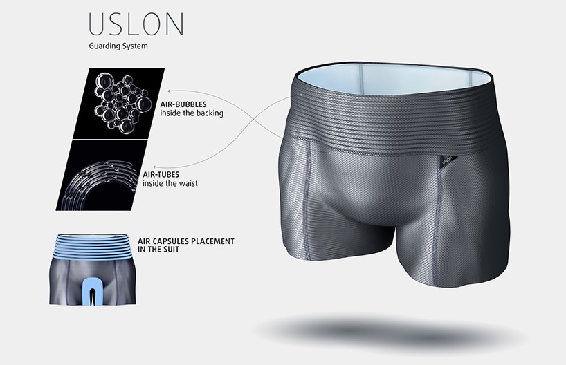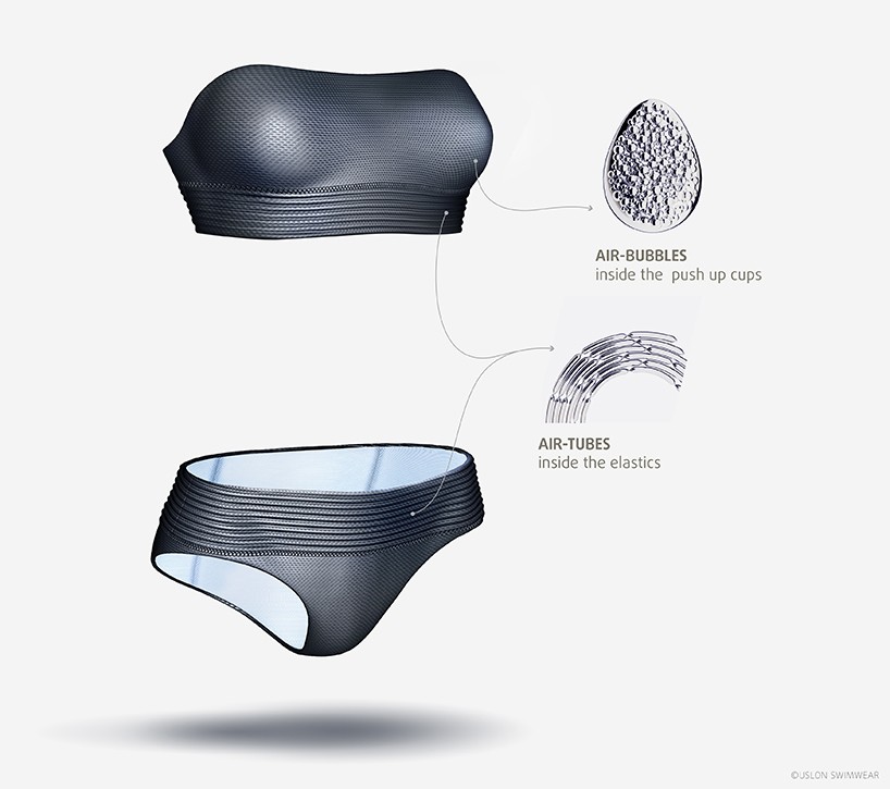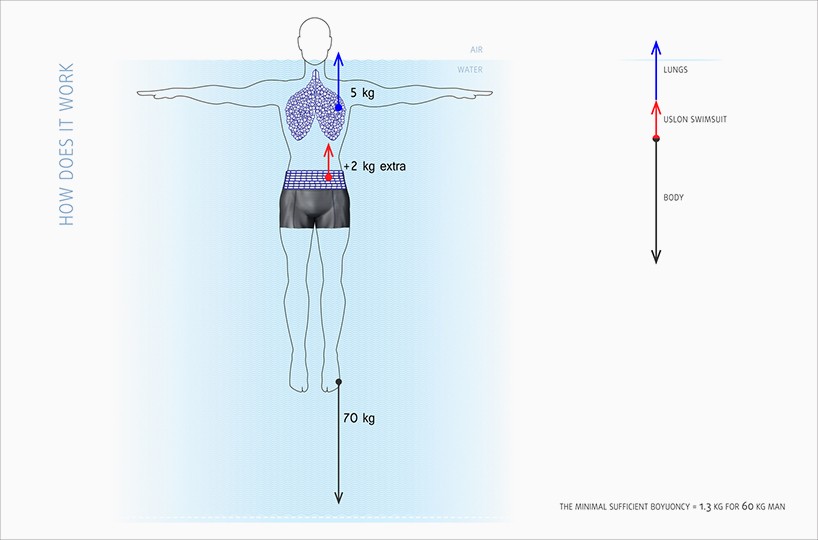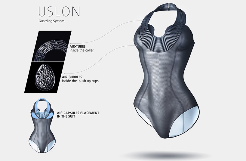 Uslon es un nuevo traje de baño que te mantiene a flote. El concepto fue desarrollado por Katerina Semenko y Valery Graznov. El traje de baño tiene pequeñas cápsulas llenas de aire cosidas alrededor de la cintura y el cuello, lo que permite que el traje de baño mantenga al nadador por encima del agua.