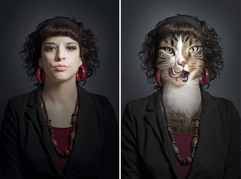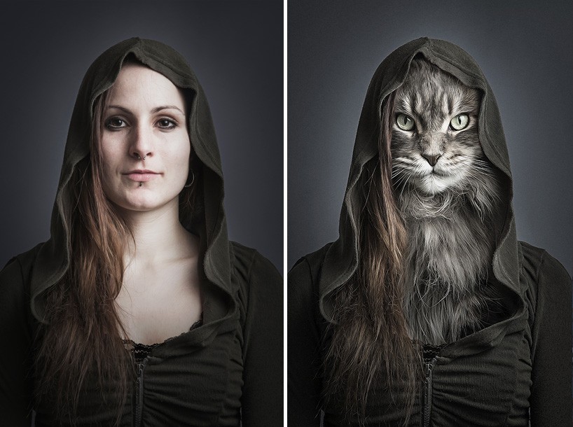fotógrafo suizo Sebastián Magnani reemplazó los rostros de los dueños en las fotos con los bozales de sus mascotas. La galería de fotos presenta fotos de antes y después de dueños de gatos versus sus mascotas peludas en forma humana.