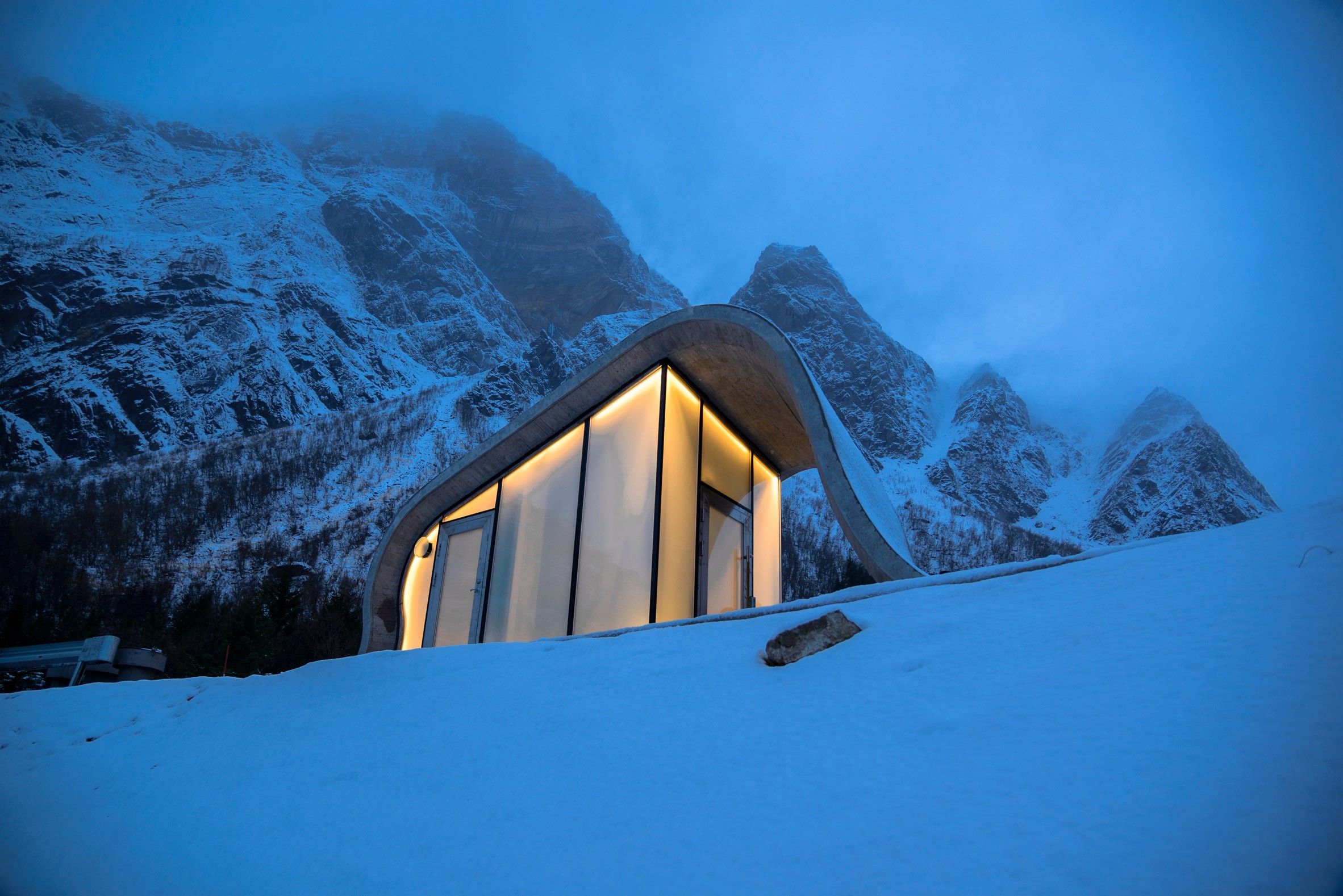 La arquitectura es, sin duda, la superpotencia de Noruega. Y esto también lo demuestra el último ejemplo: Ureddplassen, un área de descanso, un monumento y también un baño público, que se encuentra a lo largo de la pintoresca ruta de senderismo Helgenadskysten.