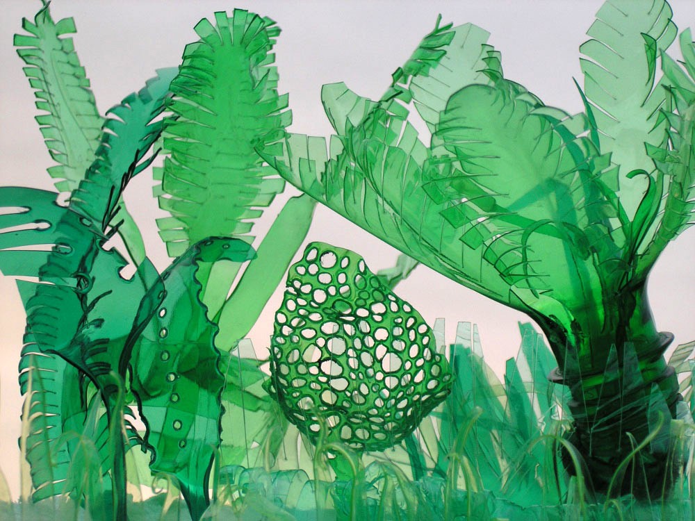 A la artista checa Veronika Richterová le apasiona crear con botellas de PET recicladas. Durante la última década, ha utilizado muchos métodos de corte, calentamiento y montaje para crear esculturas transparentes que van desde cocodrilos y candelabros hasta plantas, que veremos a continuación. Su obsesión por las botellas no acaba en la creación artística.