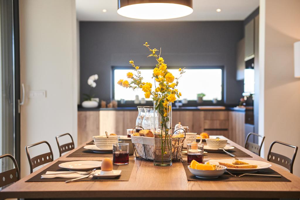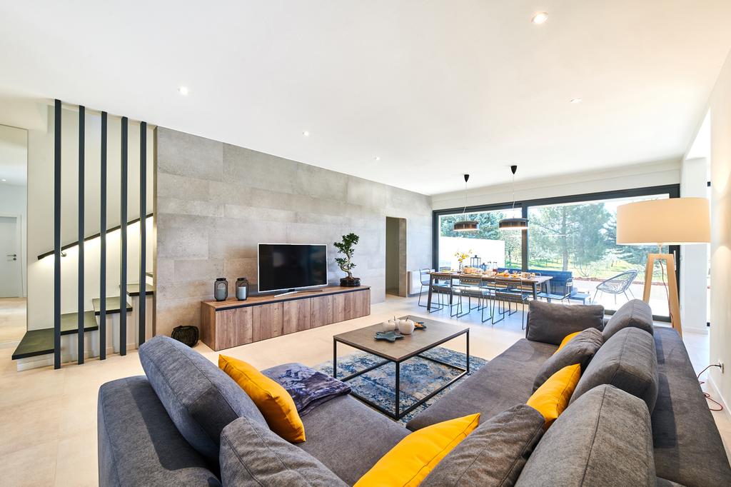 En la planta baja de la villa hay un pasillo de un espacio abierto, una sala de estar, un comedor y una pequeña cocina. Grandes superficies de vidrio te permiten ver lo que sucede en la terraza y junto a la piscina tanto desde la cocina como desde el comedor. En la planta baja hay una habitación doble con cama de matrimonio y baño privado. También hay una lavadora, un hervidor de agua y un aseo de servicio pequeño. Las escaleras internas conducen al piso superior donde están tres habitaciones dobles con baño propio y balcon frances.