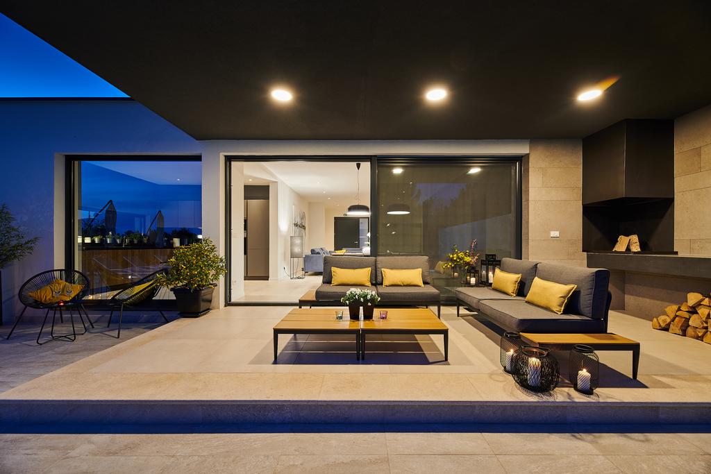 Villa Condesa Cubre 450 metros cuadrados. Seguro que te encantará su imagen exterior, que lo adorna. un jardín rico en vegetación, huerta y piscina al aire libre en el tamaño de 37 metros cuadrados. La terraza exterior está equipada con cómodos muebles modernistas, desde donde también podrás contemplar la vista parte del mar Adriático. Las cálidas tardes de verano son especialmente mágicas, con faroles encendidos y olor a barbacoa. Junto a la piscina también hay 8 tumbonas y una ducha con calentador de agua solar.