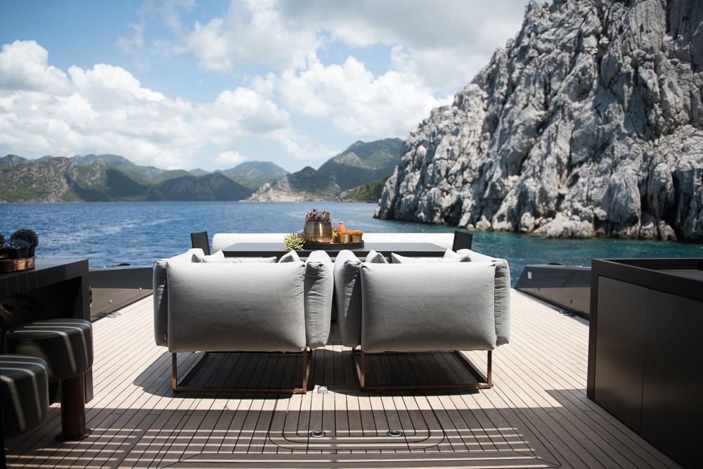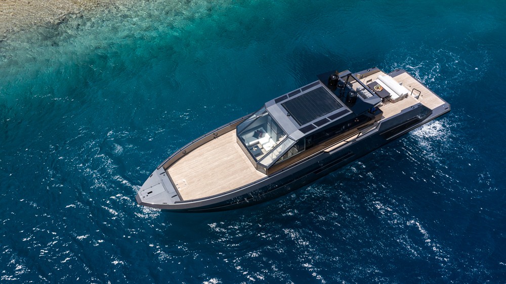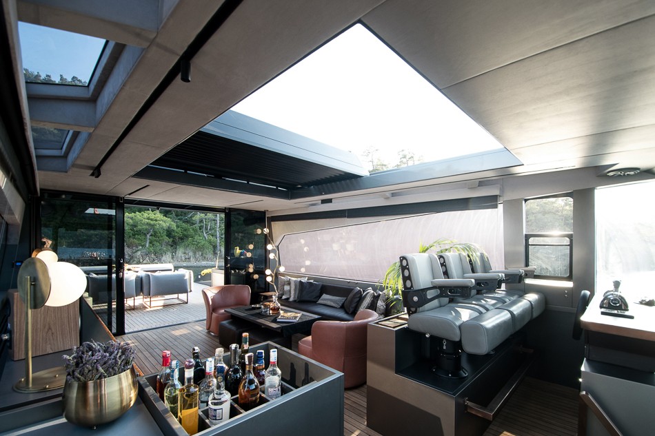 La cabina de cubierta es en forma de invernadero, frente a él hay una terraza más grande y de usos múltiples y escalones en terraza con asientos incorporados que conducen al agua. Conducen el yate tres motores Volvo Penta, y su casco de carbono puede navegar a gran velocidad hasta 40 nudos.
