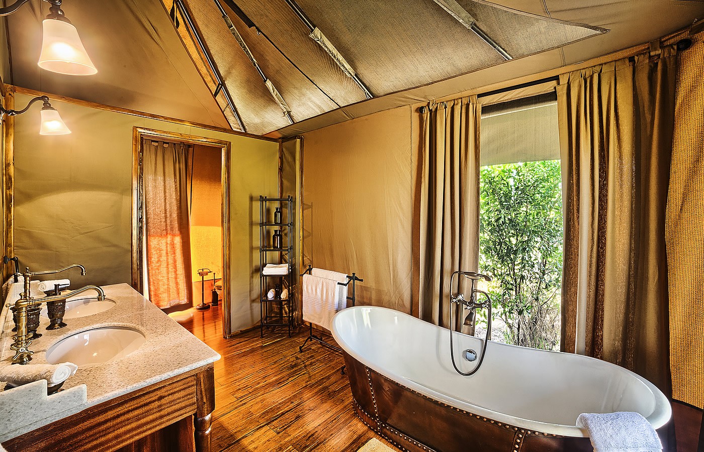 Notranjost posameznega šotora je oblikovana v klasičnem safari stilu z uporabo lesa. Mehka ležišča s snežno belimi zavesami dajejo interierju svežino in romantično vzdušje. S terase hotela ali pa kar med plavanjem v bazenu lahko opazujete redke vrste živali, ki se prosto gibajo med drevesi na območju parka.