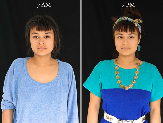 Zjutraj in zvečer smo ljudje povsem druga oseba, vsaj kar se tiče videza. Ta tema je pritegnila belgijsko fotografinjo Barbaro Iweins, ki je na primeru portretov (serija 7AM-7PM) prikazala neverjetno stilsko preobrazbo čez dan, ki pa se je niti ne zavedamo. Svoje portretirance je ujela ob sedmih zjutraj in sedmih zvečer.