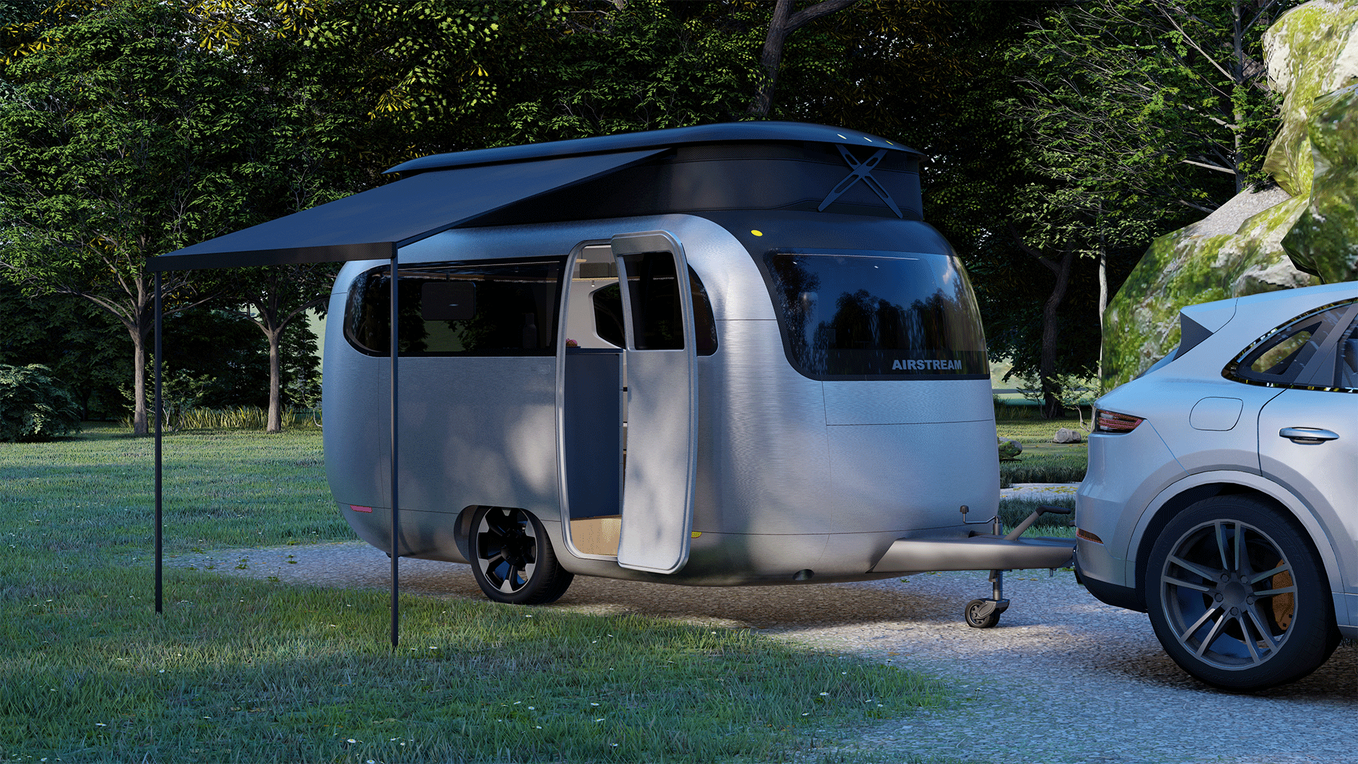Käsitteellinen sisustus matkaperävaunut Airstream Studio FA Porschella on innovatiivinen design, mikä lisää tilaa. Ikkunoiden ja kattoikkunoiden käyttö luo tilavan sisustuksen tunteen, joka yhdistää omistajat ulos. Takaluukun uudelleensuunnittelu yhdistää entisestään sisä- ja ulkotilaa saranoidulla luukulla ja alaslaskevalla takaluukulla. Voimme kiinnittää varjostimen luukkuun ja suunnitella sitten seuraavan matkaseikkailumme mukavasti viileässä varjossa.