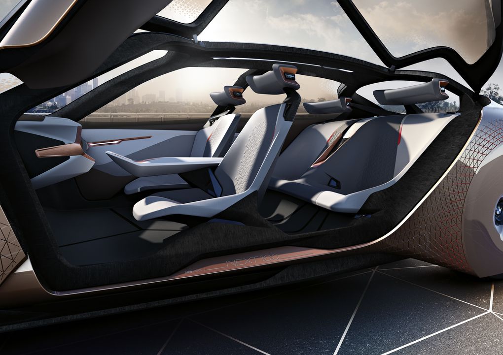 BMW Vision Next 100 -konsepti se on autonomisen ajoneuvon tutkimus, joka noudattaa täysin kuljettajan tarpeita. BMW:llä he saavuttivat sen, että kuljettaja ja auto tuntevat olevansa yhtä järjestelmän kanssa.Elävä geometria” (live geometria), joka kommunikoi kuljettajan kanssa Boost- ja Ease-tiloissa. Ensimmäisessä se jättää ohjauksen hallinnan kuljettajalle ja ga:lle aktiivisella turvajärjestelmällä suojelusenkelinä suojaa vaarallisilta tilanteilta (näytöllä ihanteelliset ajolinjat, neuvoo optimaalisesta nopeudesta, ohjauspyörän kallistuksesta, näkymättömien esteiden projisointi ...), kun taas Easy-tilassa kuljettaja jättää hallinnan ja valinnanvapauden täysin ajoneuvolle, koska se on tarkoitettu autonomiseen ajoon (ohjauspyörä on tallennettu kojelautaan, niskatuet on säädetty, kuljettajan ja matkustajan istuimet kääntyvät toisiaan kohti...). Molempien järjestelmien mukaisesti sisustus muuttuu suuresti, mikä voi ylpeillä autolla 800 liikkuvaa osaa.