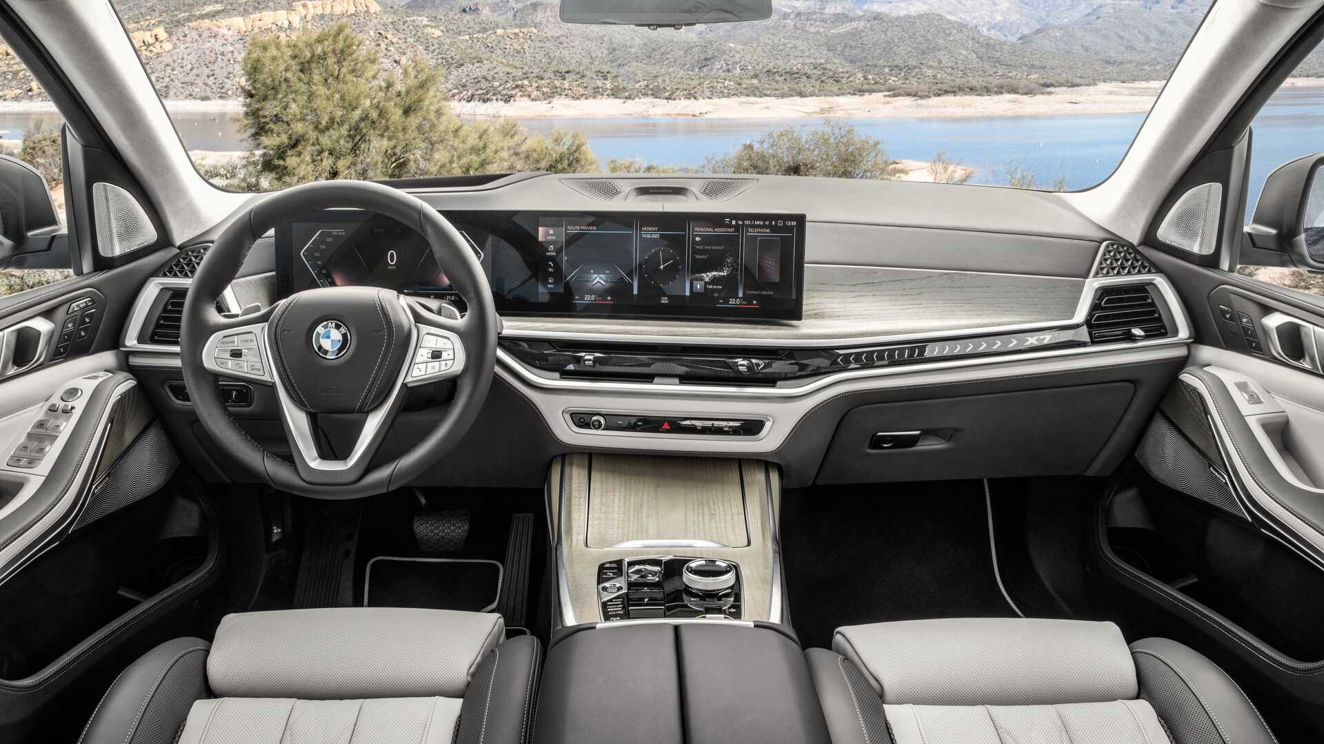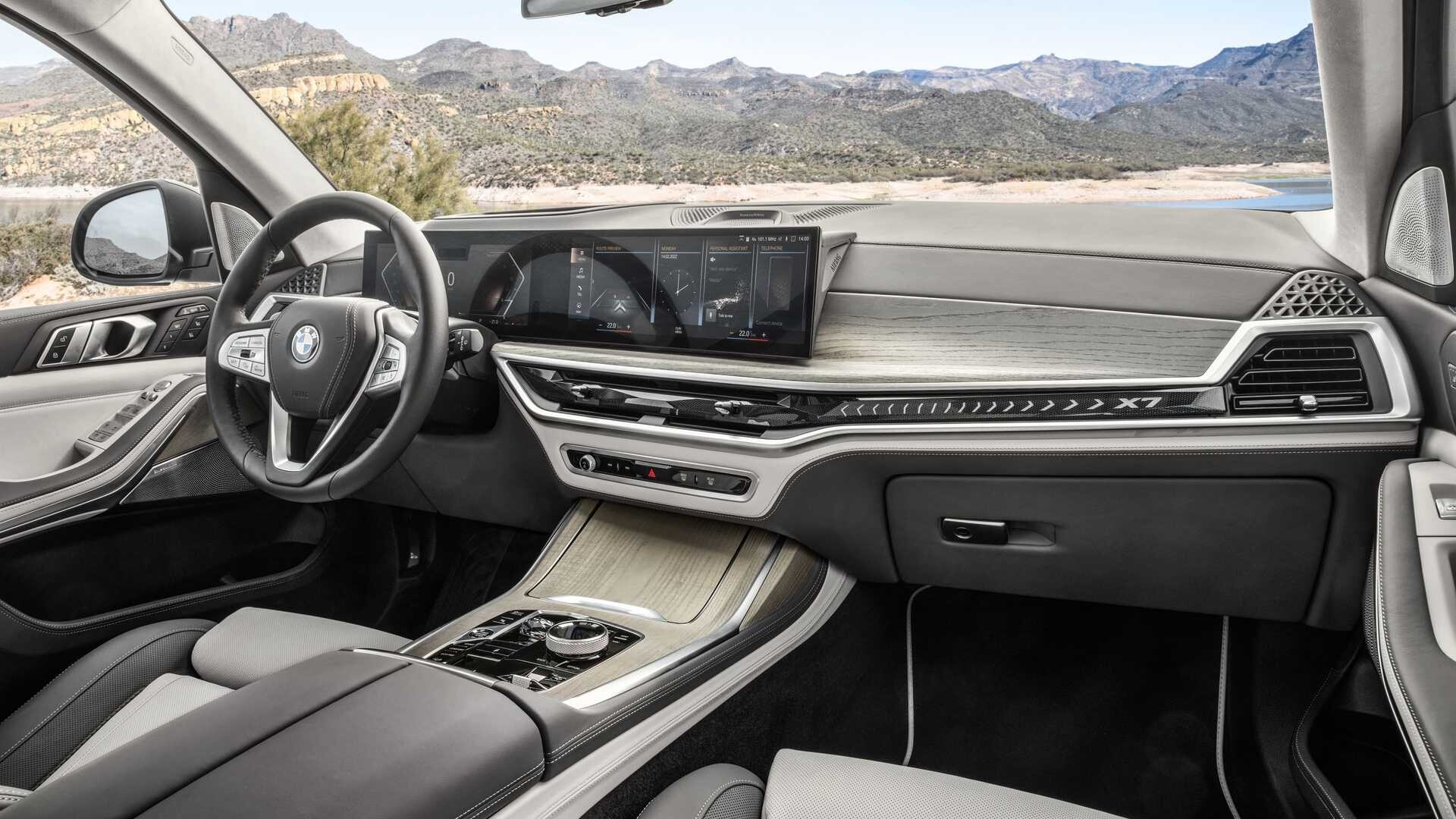 BMW X7:n uudessa versiossa on uusin infotainment-järjestelmä iDrive 8. Yhdessä he tekevät sen 12,3 tuumaa näyttö omistettu digitaalisille mittareille ja 14,9 tuumaa keskus kosketusnäyttö. Tällä kertaa iDrive 8 on ensimmäistä kertaa saatavilla mallissa, jossa on "klassinen" moottori, sillä tähän asti se oli asennettu vain iX- ja i4-malleihin. Kaksisävyinen nahkaverhoilu kuuluu nyt vakiopakettiin ja on myös saatavilla vegaani keinonahkaa Sensafin.