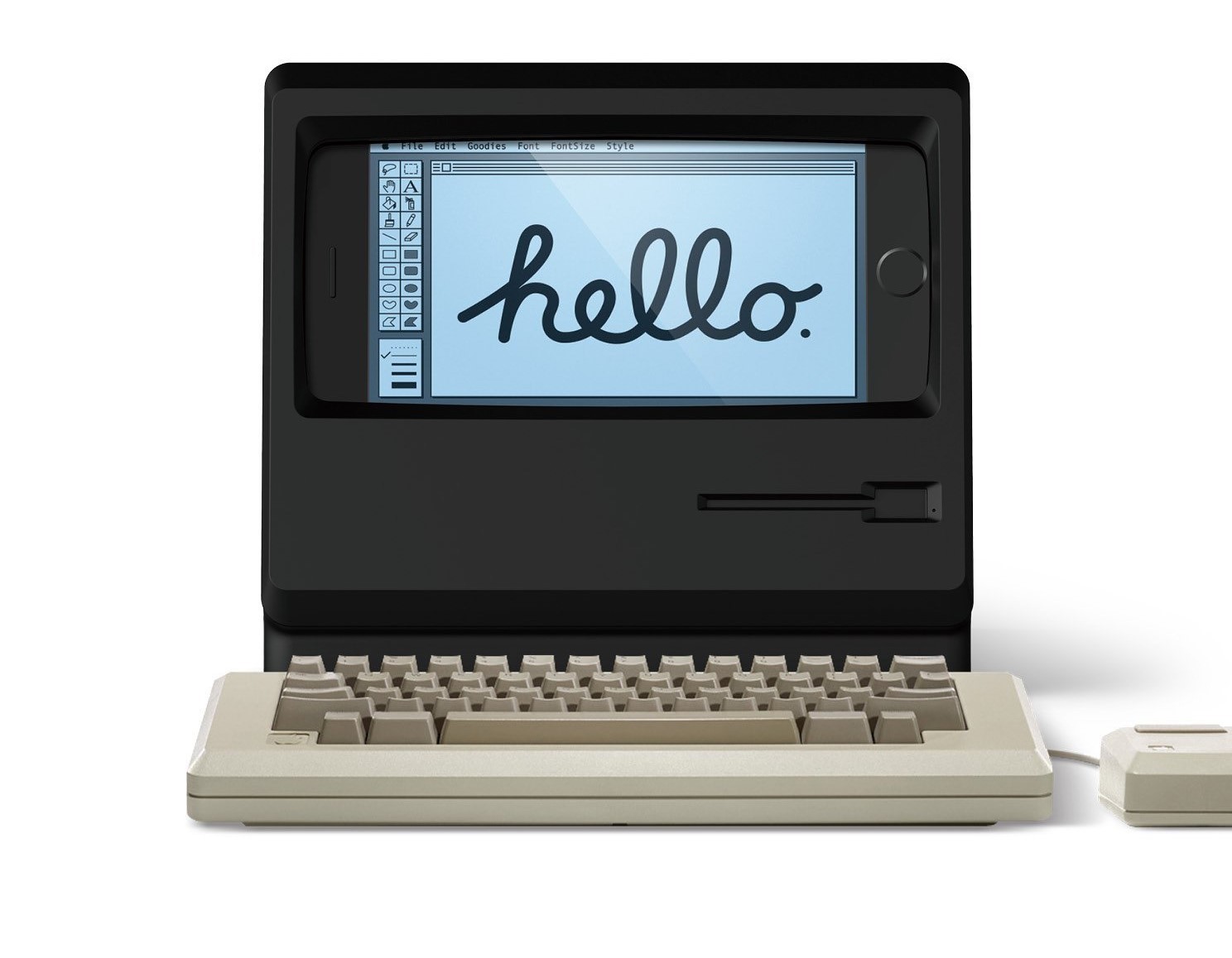 Elago M4, teline iPhonelle. Telineessä on paikka älypuhelimelle, josta tulee retro tietokoneen näyttö. Pääset silti käyttämään äänenvoimakkuuspainikkeita, ja voit myös ladata puhelinta välissä. Voit myös yhdistää sen näppäimistön kanssa.