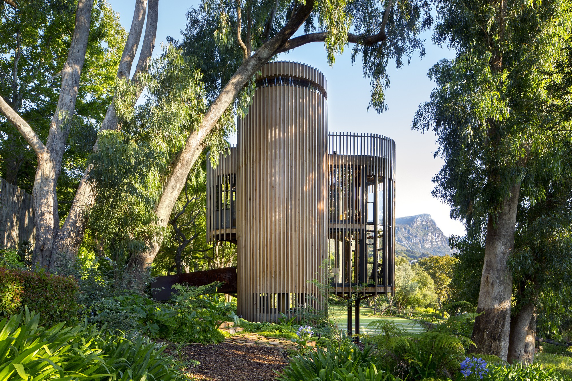 Epätavallinen puutalo jolla on nimi Kapkaupungin puutalo sijaitsee Etelä-Afrikan tasavalta. Se luotiin luovassa arkkitehtitoimistossa Pikku Vorster. Talo ammentaa inspiraatiota ympäristöstään. Perusteet koostuvat neljästä teräspilarista, joita yhdistää keskiosa. Kuten taloa ympäröivät puut, myös talon sisustus on korostettu pystysuoralla puulla elementtejä. Ne ovat ensimmäisessä kerroksessa olohuoneet, toisessa makuuhuone, ja kolmannessa kattoterassi. Päämateriaalit ovat raakateräs ja punainen setri, jotka sulautuvat kauniisti taloa ympäröivään luontoon. Voit nähdä lisää Cape Town Tree Housesta alla olevassa kuvagalleriassa.
